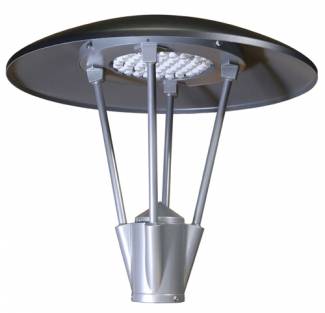 Four sturdy struts connect to a large spun aluminum hood and solid cast base.