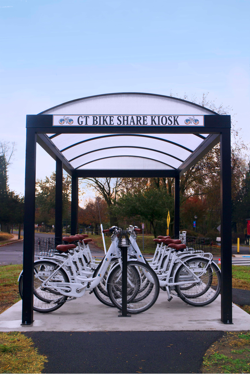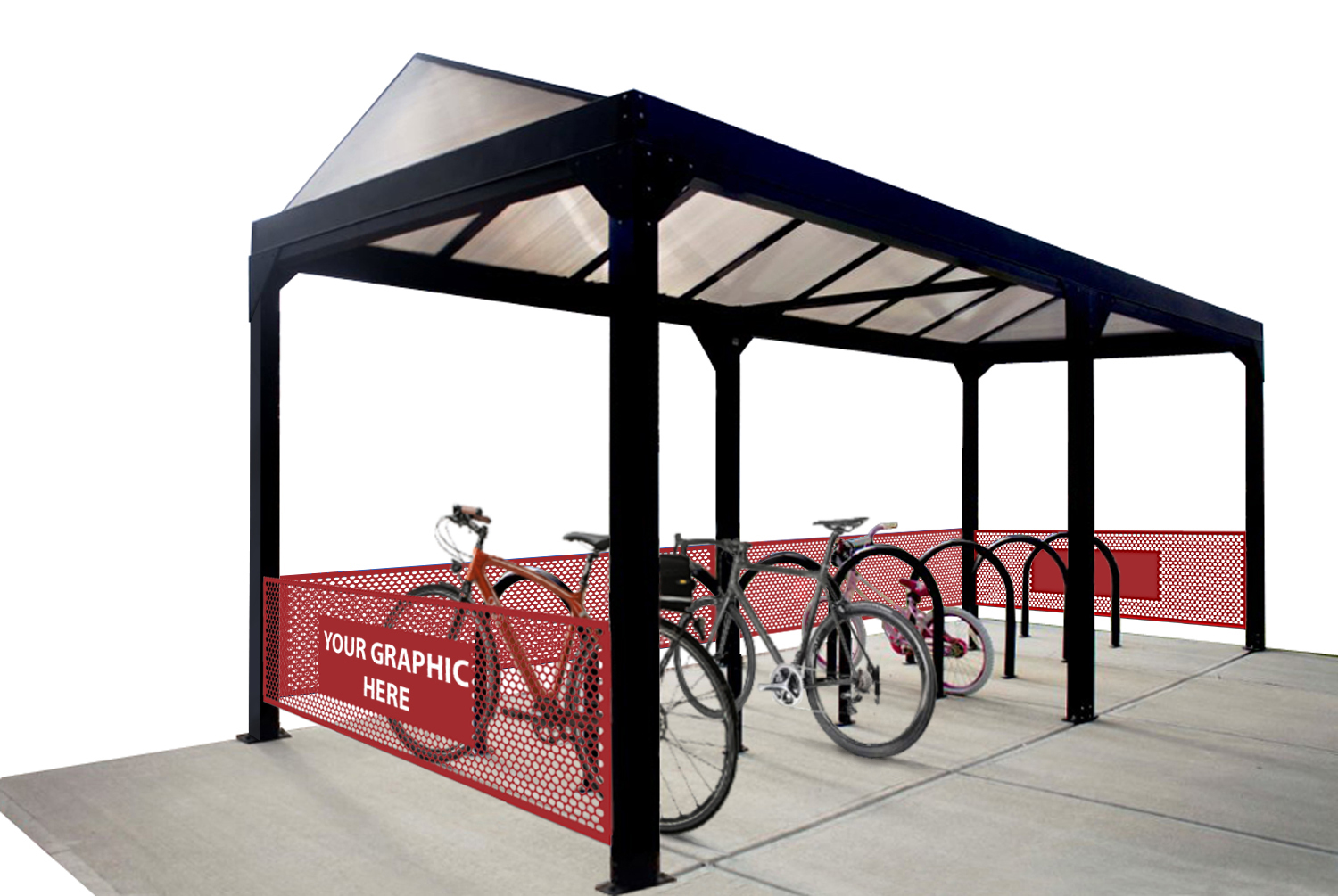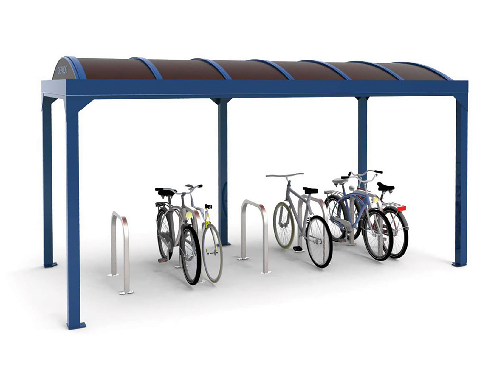 Newport is an economical bike shelter manufactured in rust proof, anodized aluminum with integrated "no splash" rain gutters and leaders. Choice of twin wall polycarbonate barrel, gable or flat roof styles. Gable also available with standing seam aluminum. Accommodates one or two-sided bike parking. Pre-fabricated roof for quick assembly.