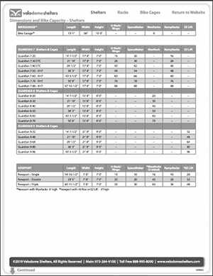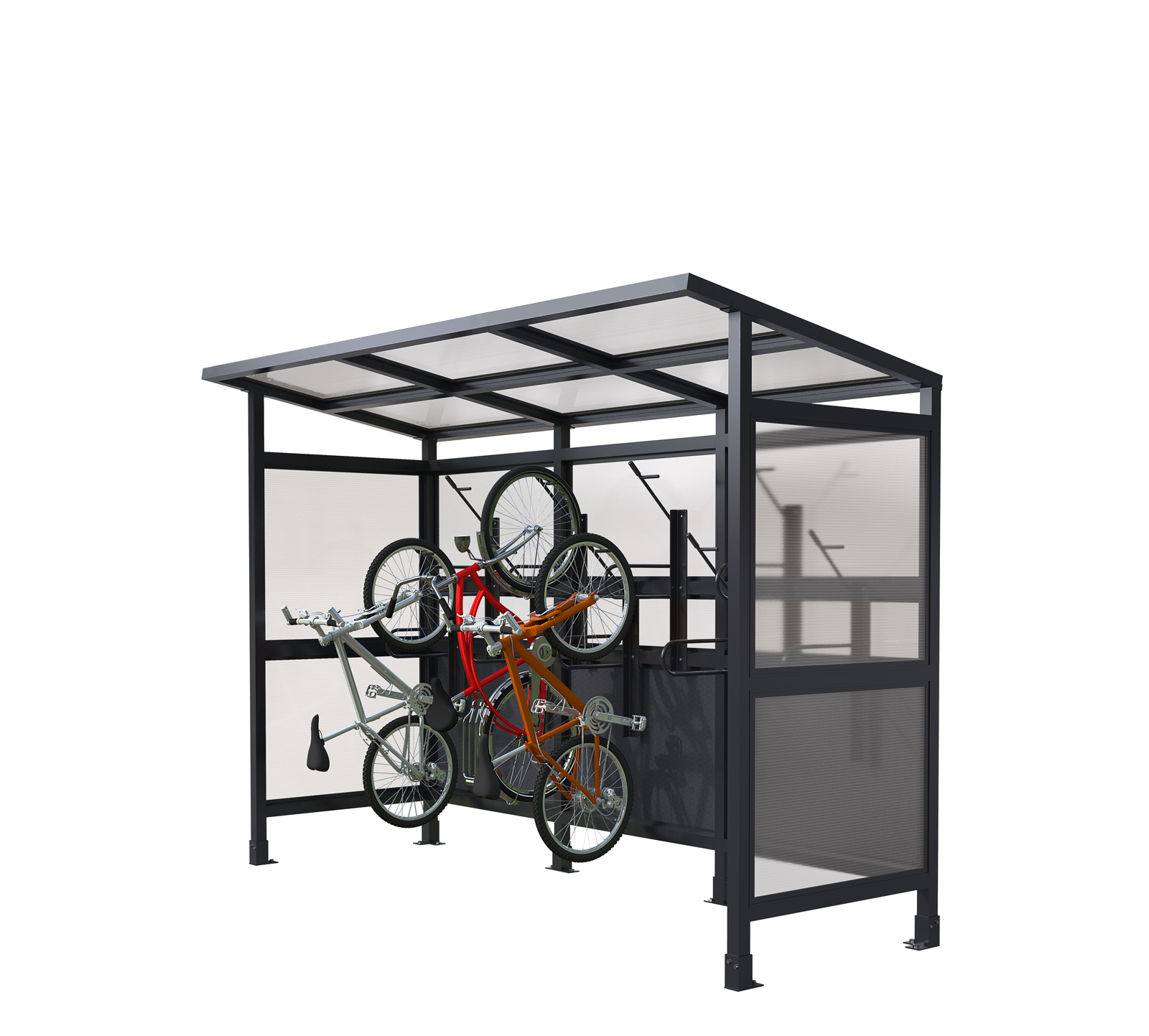 When space is limited, VeloMax is a practical solution. Only 4' wide x 12' 6" long, VeloMax is enclosed on 3 sides and parks 9 bikes vertically on high-security MaxRacks. Modular, aluminum construction and pre-assembled roof and walls for quick and easy assembly. 6 bike model also available. Custom branding options.