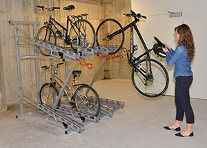 Hi-Density Rack by CycleSafe offers space efficient bike parking with two tier capacity. Simply roll the bike along the channel provided to secure the wheel and frame in place. Each Hi-Density rack allows double level parking to hold (4) bicycles and can be combined in rows for large installations. Ideal solution for bike rooms, bike cages or parking garages.