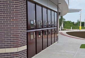 CycleSafe ProPark double tier bike lockers at a transit center, with custom finish and windows specified for the door. This application utilizes the swing handle lock option. We now offer electronic cellular access that will offer on demand use with booking and billing through an Android or iPhone.