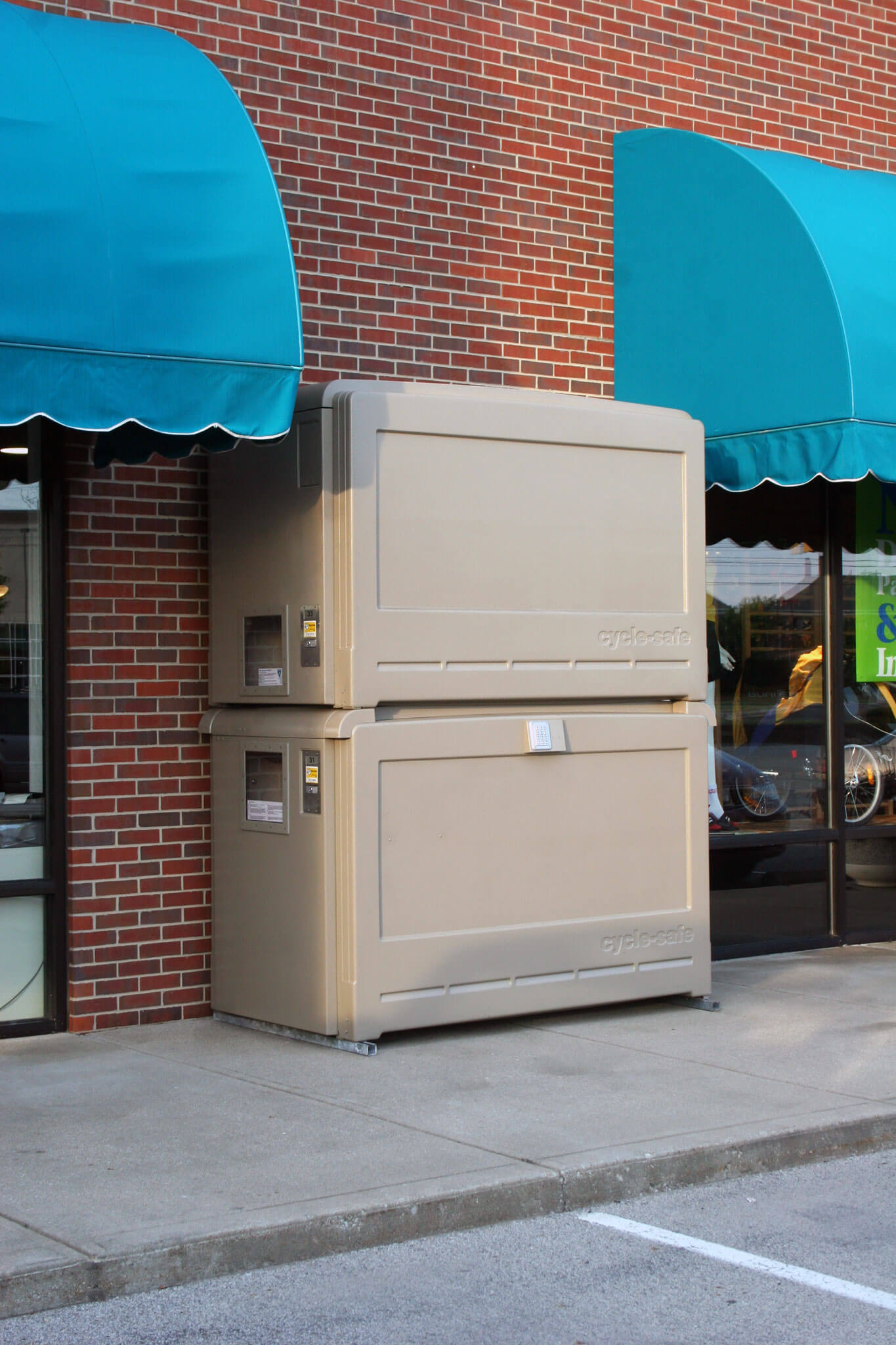 The CycleSafe ProPark® Double-Tier Door-View™ bike locker offers a (11??????_ x 11??????_) polycarbonate window in the door of each unit. This feature allows for easy viewing to identify locker contents and availability. ProPark® Double-Tier™ bike lockers maximize space efficiency to offer lower cost per square foot with twice the amount of bike parking without increasing the locker footprint.
