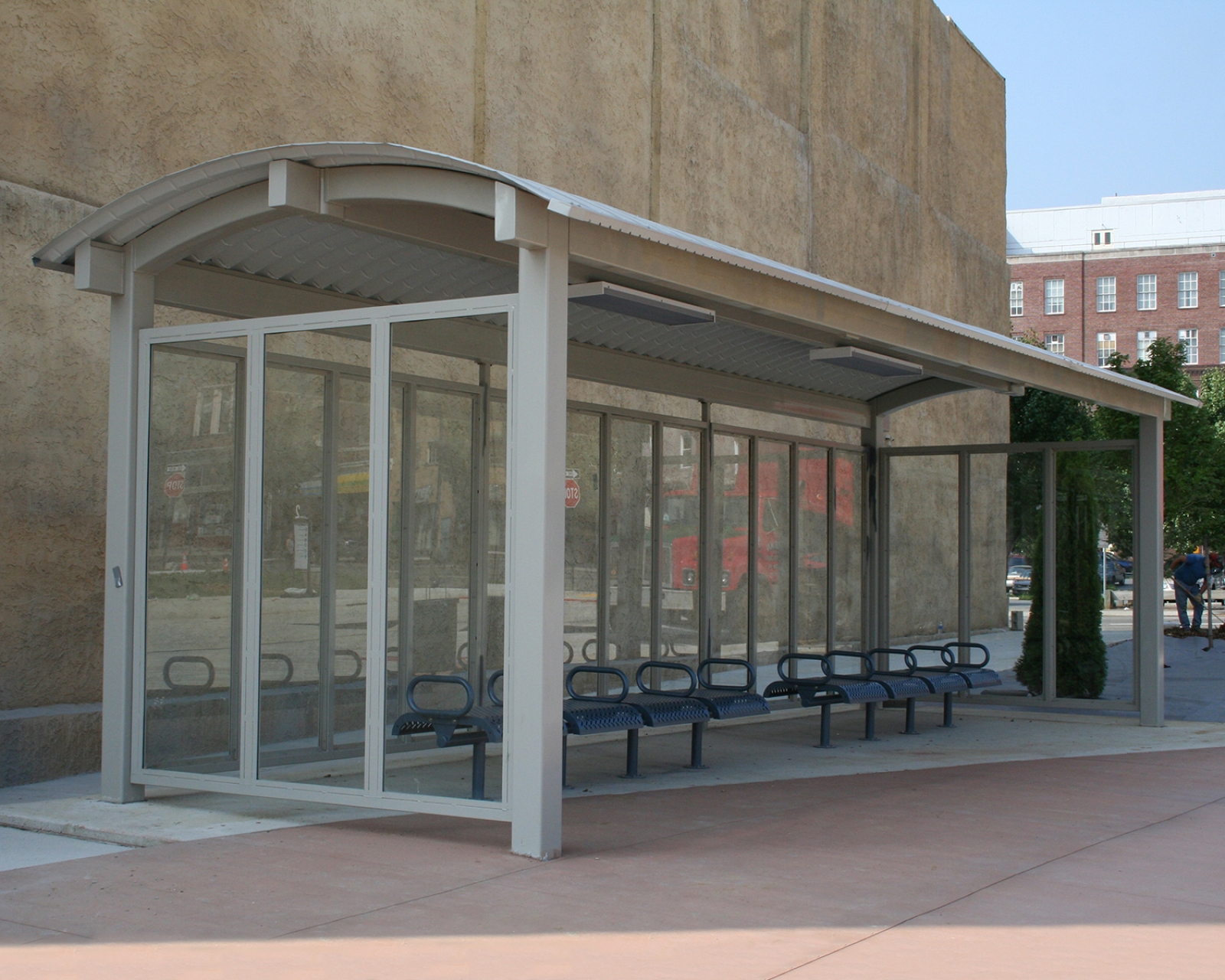 Barrel Vault Cantilever Shelters with Curved Mega-Rib Roof Panels, and Optional Tempered Glass Windscreens