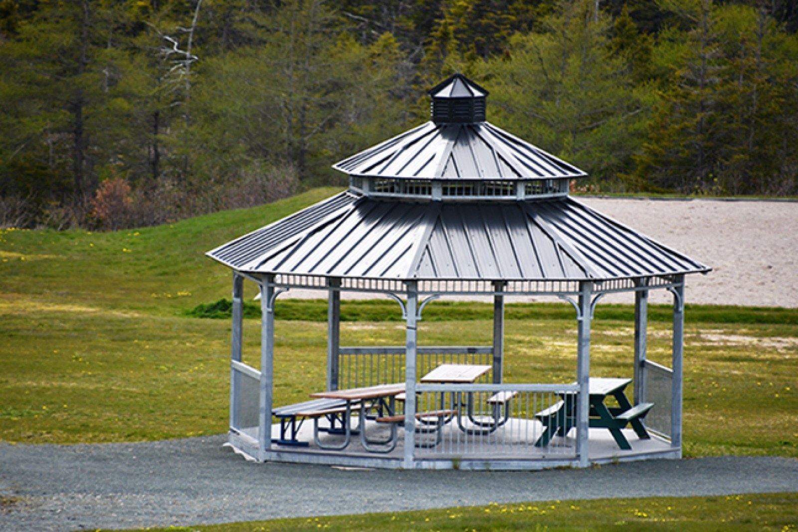 Octagonal 2 Tier Clerestory Shelter with Asphalt Shingles over Tongue and Groove Roof Deck, Sheet Metal Cupola, Upper and Overhead Linear Ornamentation, CC10-108 Square Stepped Columns, Curved Corbels, Linear Handrails, and Steel Benches.