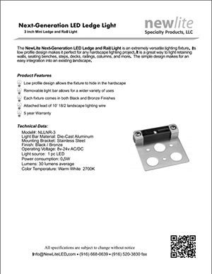 The NewLite Ledge and Rail lights are an extremely versatile lighting fixture. It's low profile design makes it perfect for any hardscape lighting project. It is a great way to light retaining walls, benches, steps, decks, railings, columns, and more. The simple breakaway corner design makes for an easy integration into an existing landscape.