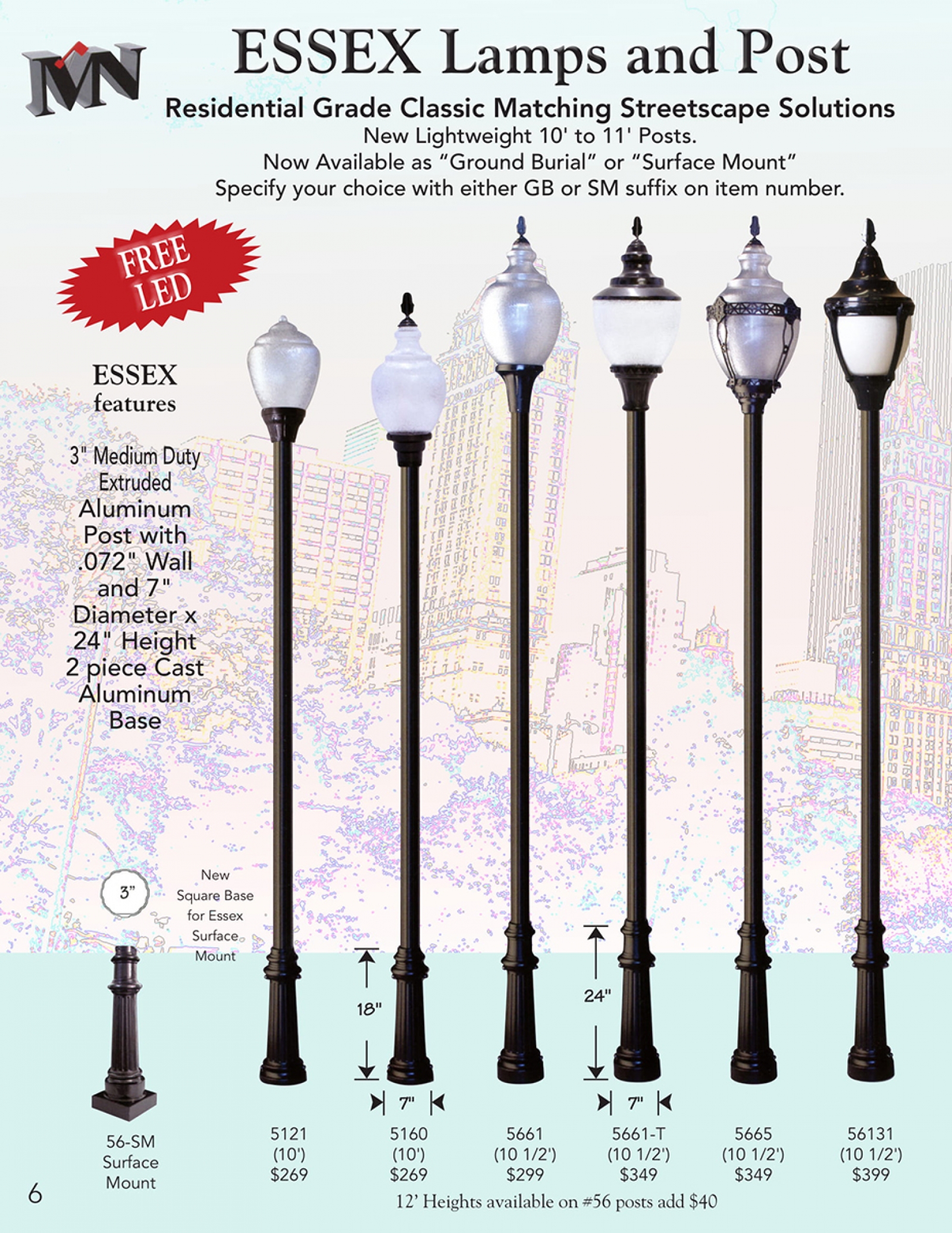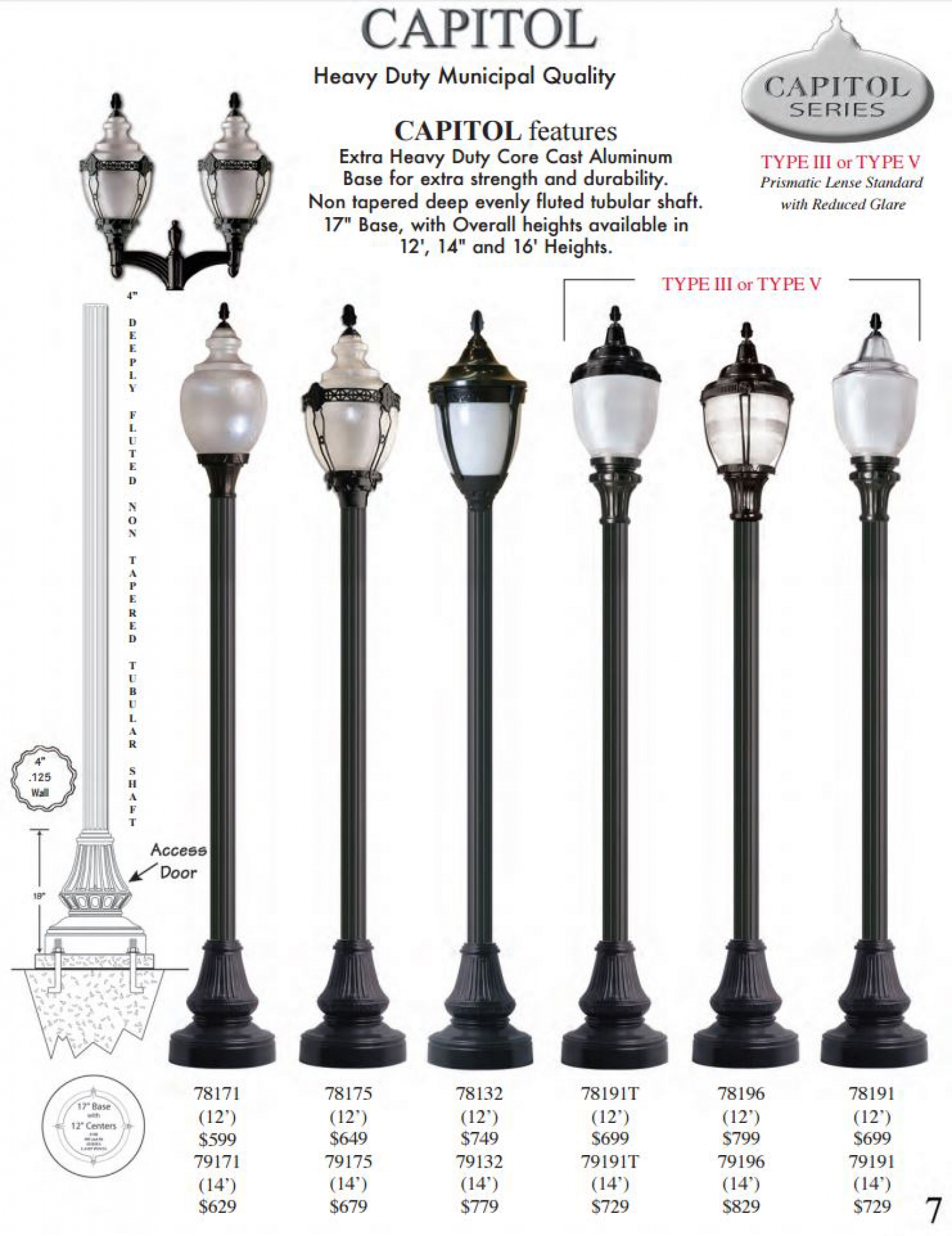 Capitol features extra heavy duty core cast aluminum base for extra strength and durability. Non tapered deep evenly fluted tubular shaft. 17" base, with overall heights available in 12', 14' and 16' heights.