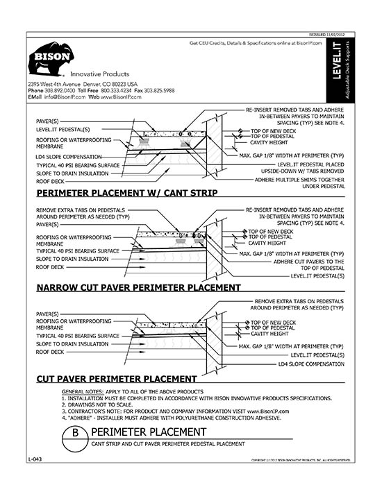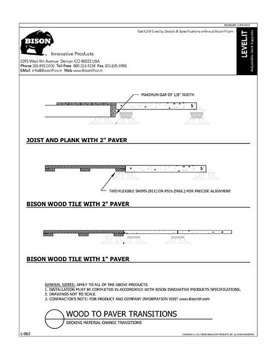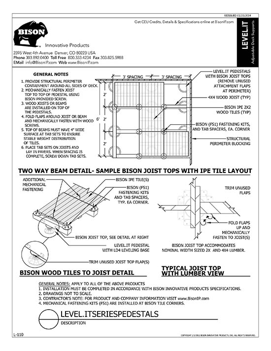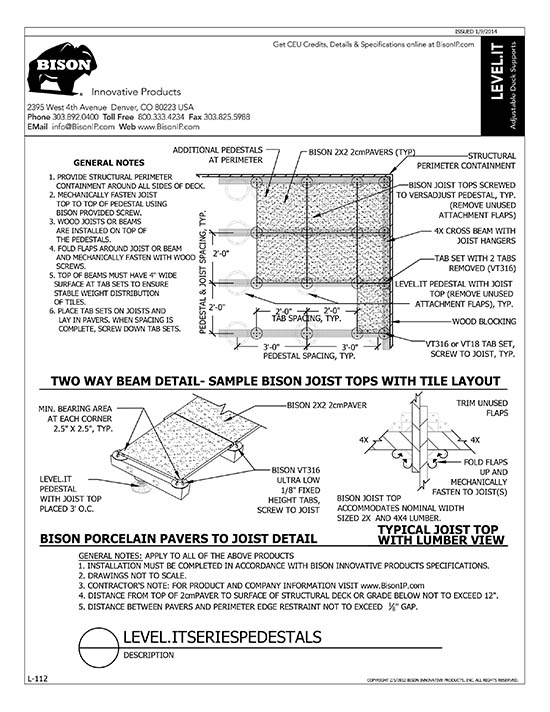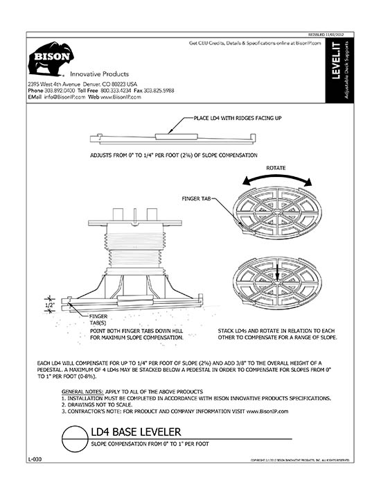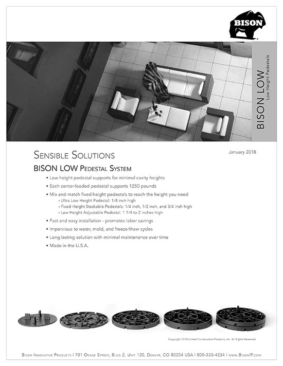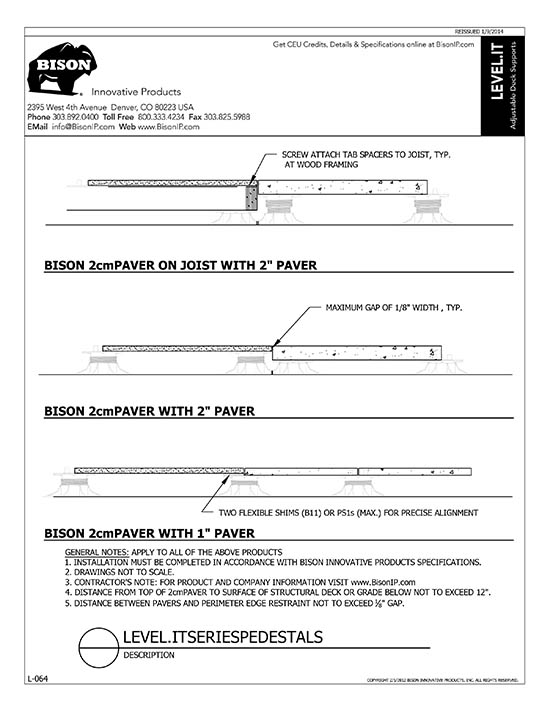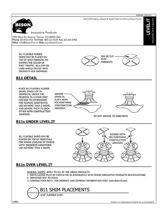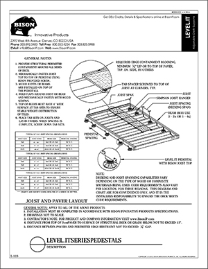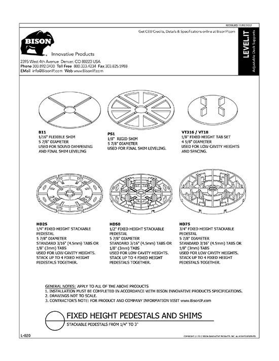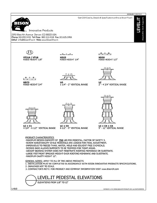 Bison Level.It adjustable deck supports are the simple solution to your decking needs! Use on rooftops, balconies, over cracked concrete patios, even on-grade! Works with any surface material, from wood tiles, traditional stringer and plank decks, natural stone, composites or concrete. With Level.it, if you can dream it, you can do it! Ideal for contractors or the do-it-yourself homeowner.