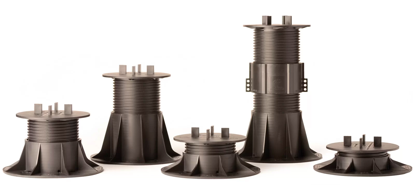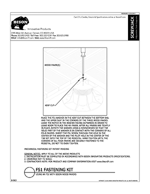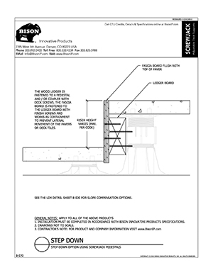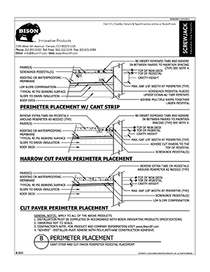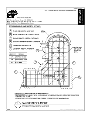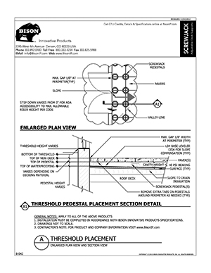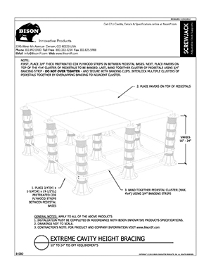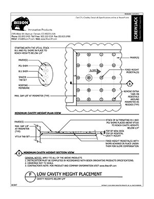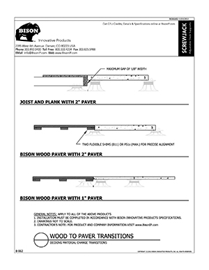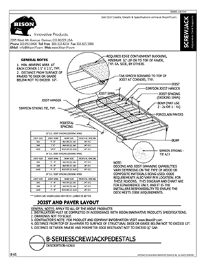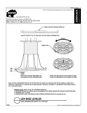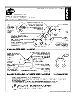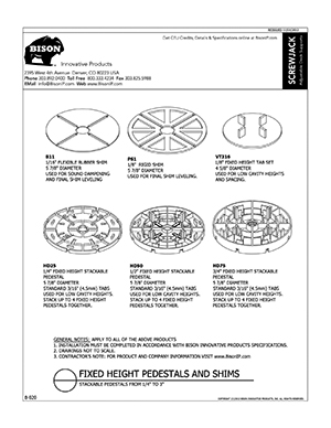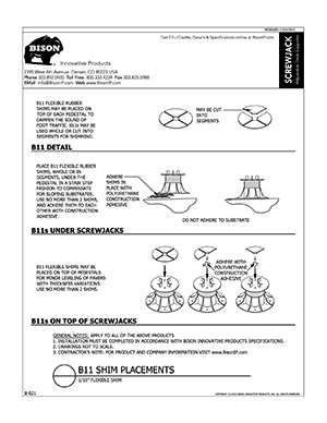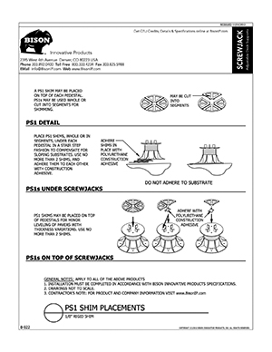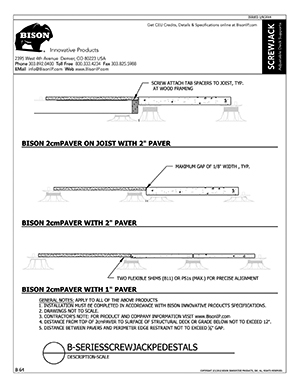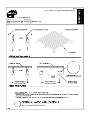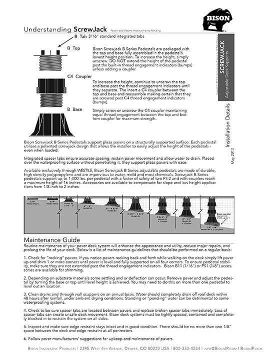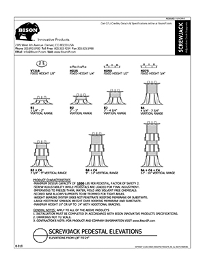 Bison ScrewJack Pedestals are designed to support heavy pavers over any waterproofed structural surface. Each pedestal utilizes a patented threaded design, making the leveling process during installation a simple turn of the pedestal base. This allows contractors, designers and installers to accurately plan, precisely align, and uniformly install level decks with a combination of ease, speed and accuracy. Integrated spacer tabs ensure accurate spacing, lock the pavers in place, and allow water to drain. Note: Bison ScrewJack Pedestals are sold exclusively in the US and Canada through Oldcastle Westile and their distributors.