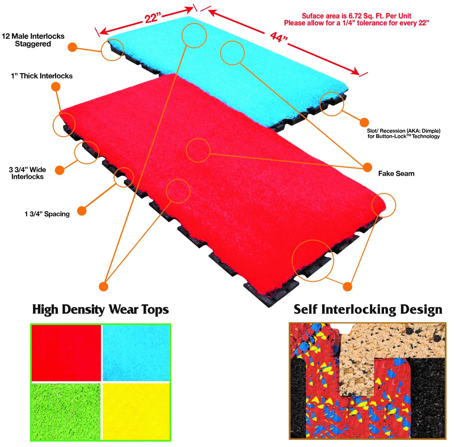Contributing to design, our self-interlocking system can provide a monolithic "step & repeat" method of installation that allows anyone to stagger the products interlocking joints anywhere as if you were installing "brickwork", commonly known as a "staggered bond" or "running bond" method of installation. This technological development acts as a backup to resist product-to-product separation, curling, peeling and most importantly vandalism. These patented systems, along with the sheer size, weight and durability of our product allows architects, engineers, designers, municipalities, building owners and operators to truly set the standard by which all others are measured. Size does matter in this case as it allows installers to install almost twice the square footage per man hour then the conventional square tiles, a savings that is unmatched in the industry today. Additionally vandalism is significantly reduced as our products will weight 40% more (per unit) due to its (overall) expanded size.
