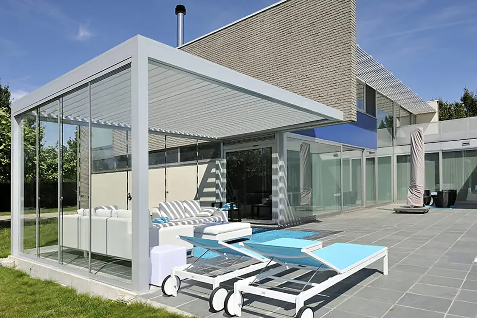Shelter 2000 modular systems by Shelter Outdoor are designed and fabricated to fit your patio, poolside or outdoor dining area. These unique aluminum structures can be freestanding, wall mounted or cantilevered from your building.