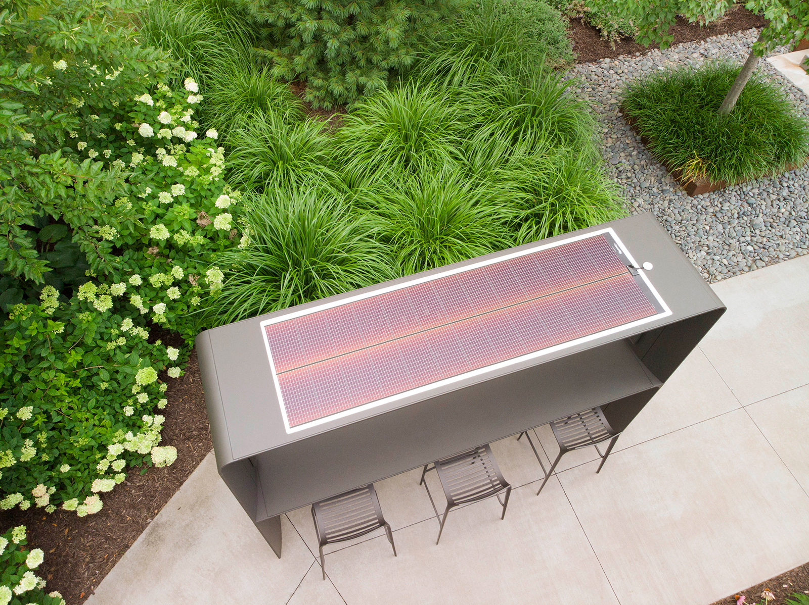 The GO OutdoorTable brings a new dimension to the communal table with integrated power that enables people to stay connected outdoors in the places where they live, learn, work, care, play and travel. In dining and standing heights, GO supports formal and informal activities, individuals and groups, in a variety of postures: sitting, standing, leaning or perching. GO has an appealing sleek and simple profile, a smooth, flat top that provides an ideal surface for writing, and rounded edges that offer a comfortable perch for hands and arms when using laptops and tablets. Its frame is hollow like an airplane wing, channeling technology out of sight. With the canopy, GO provides a sense of shelter, glare reduction for better visibility on mobile devices, and capability for lighting, display mounting and solar power.