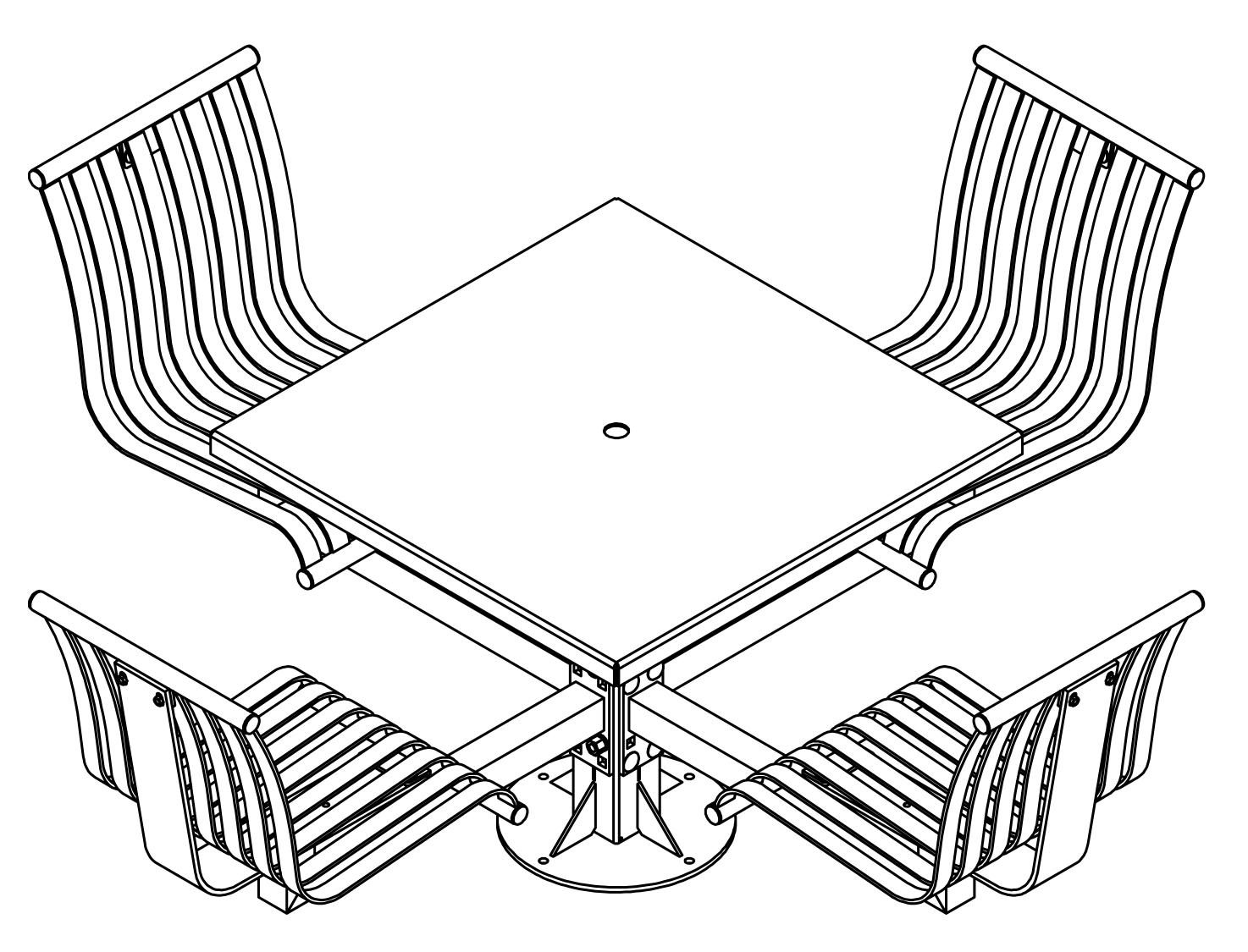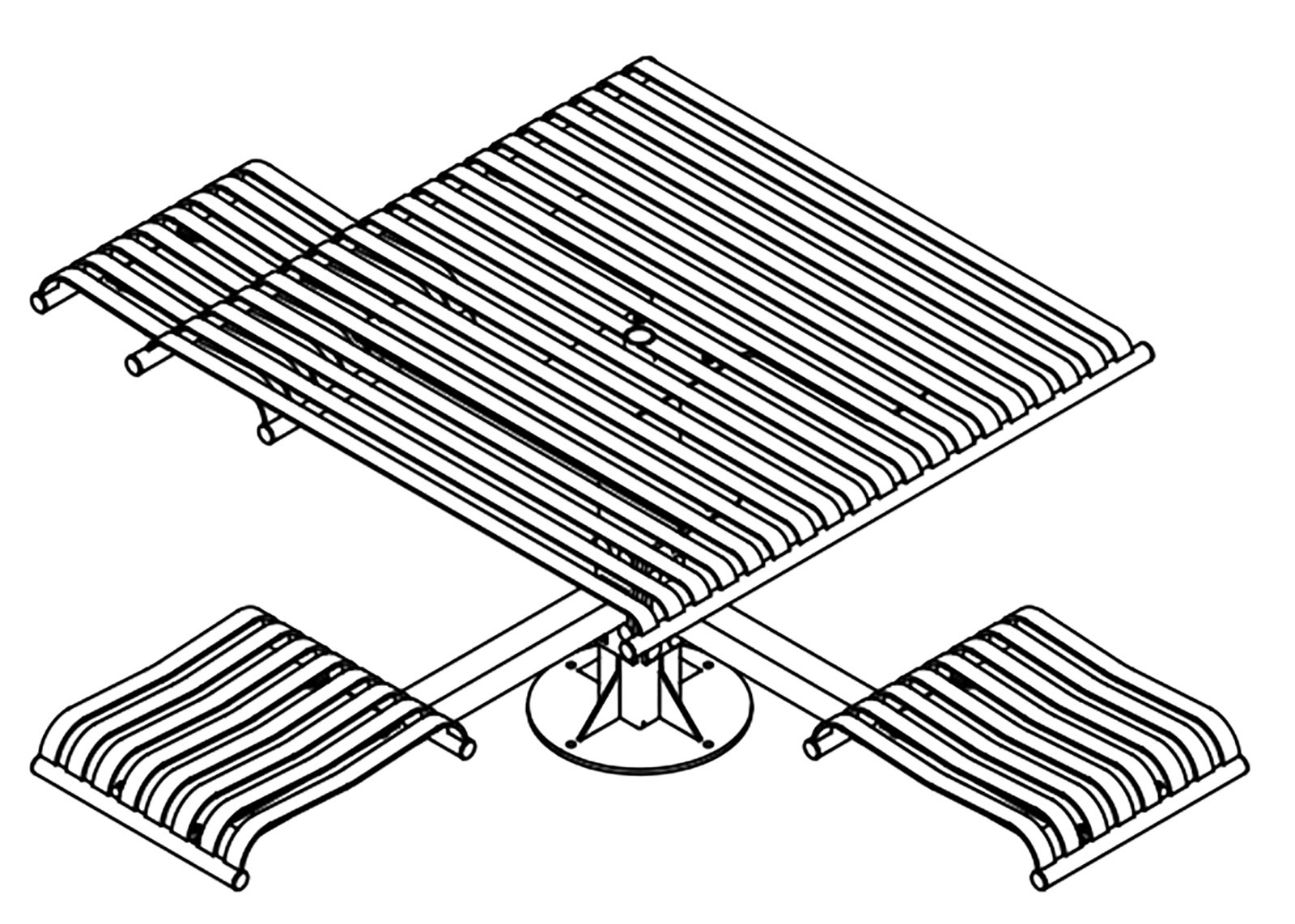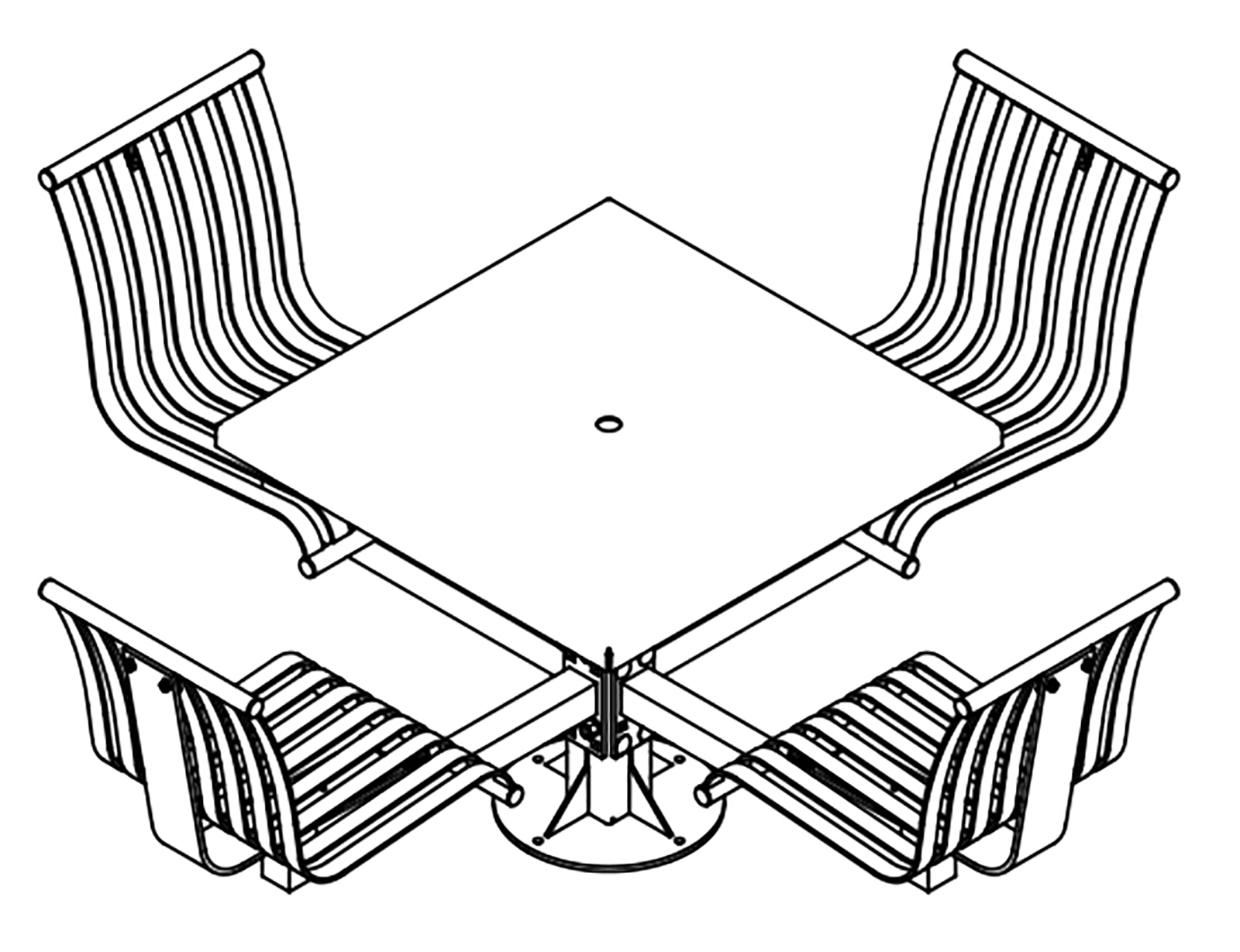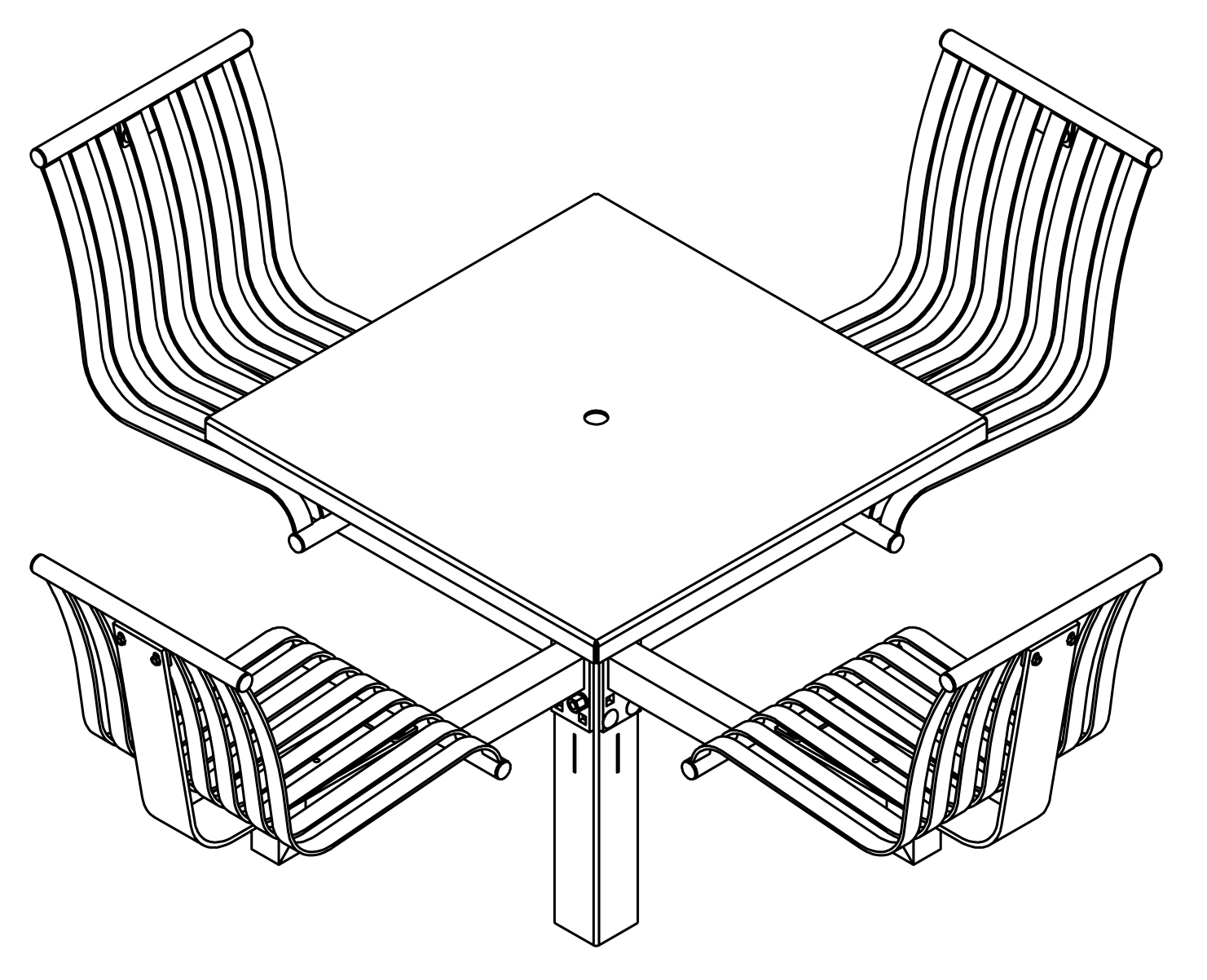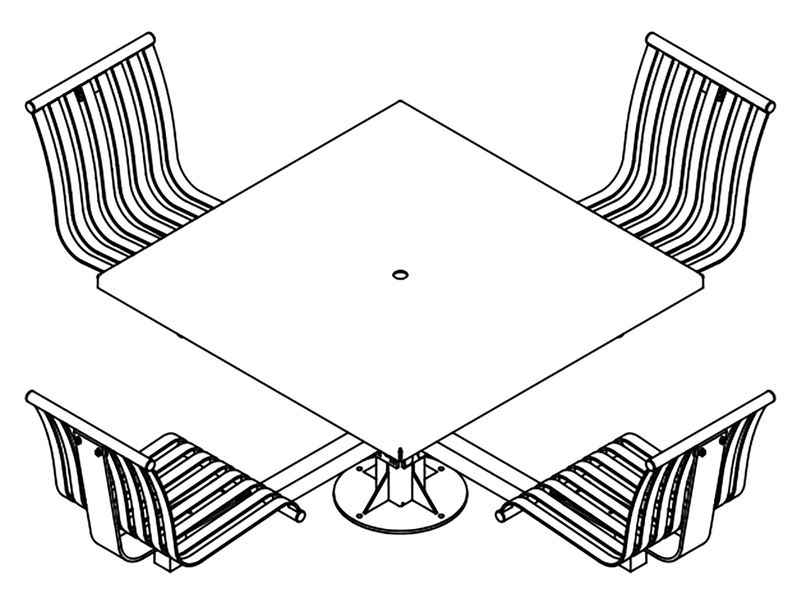 The CityView carousel tables provide clustered seating options for any patio setting. Chairs are permanently fixed to tables with support tubes that attach to the center post. CityView carousel tables offer a wide variety of design features and include round, square, ribbon style or solid table tops and can be offered in several mounting options.