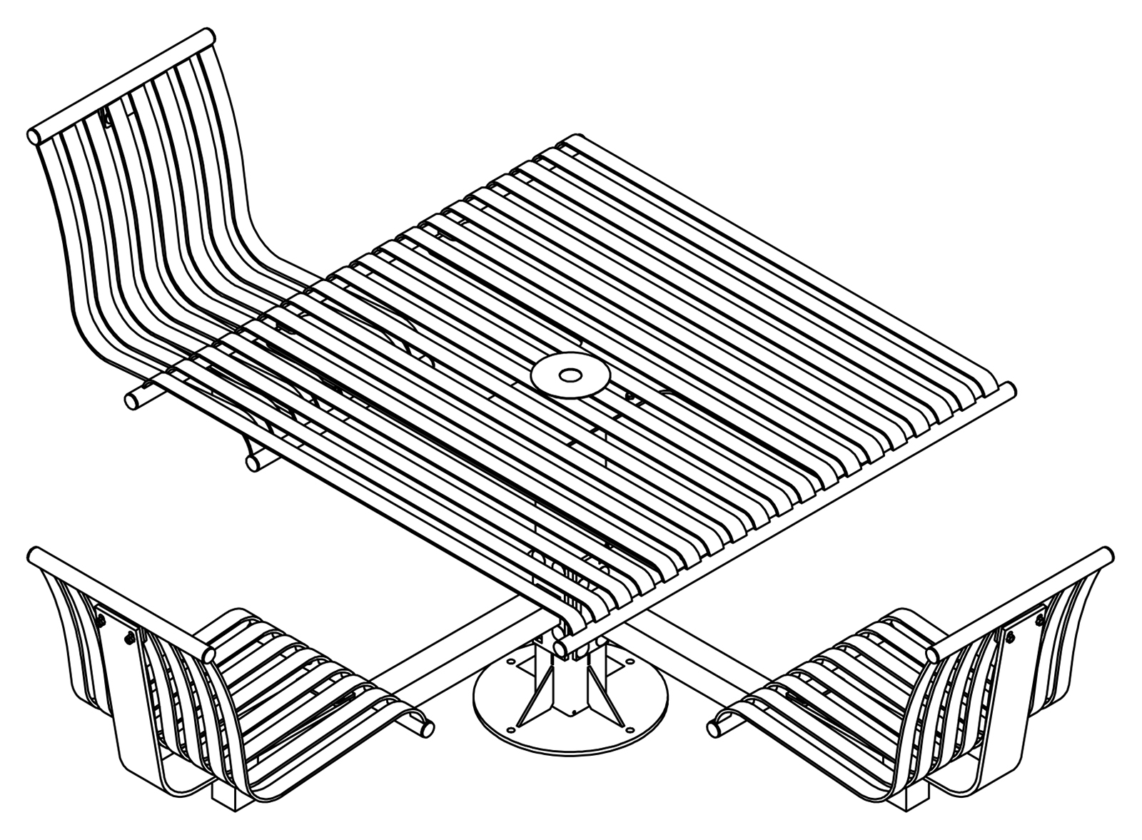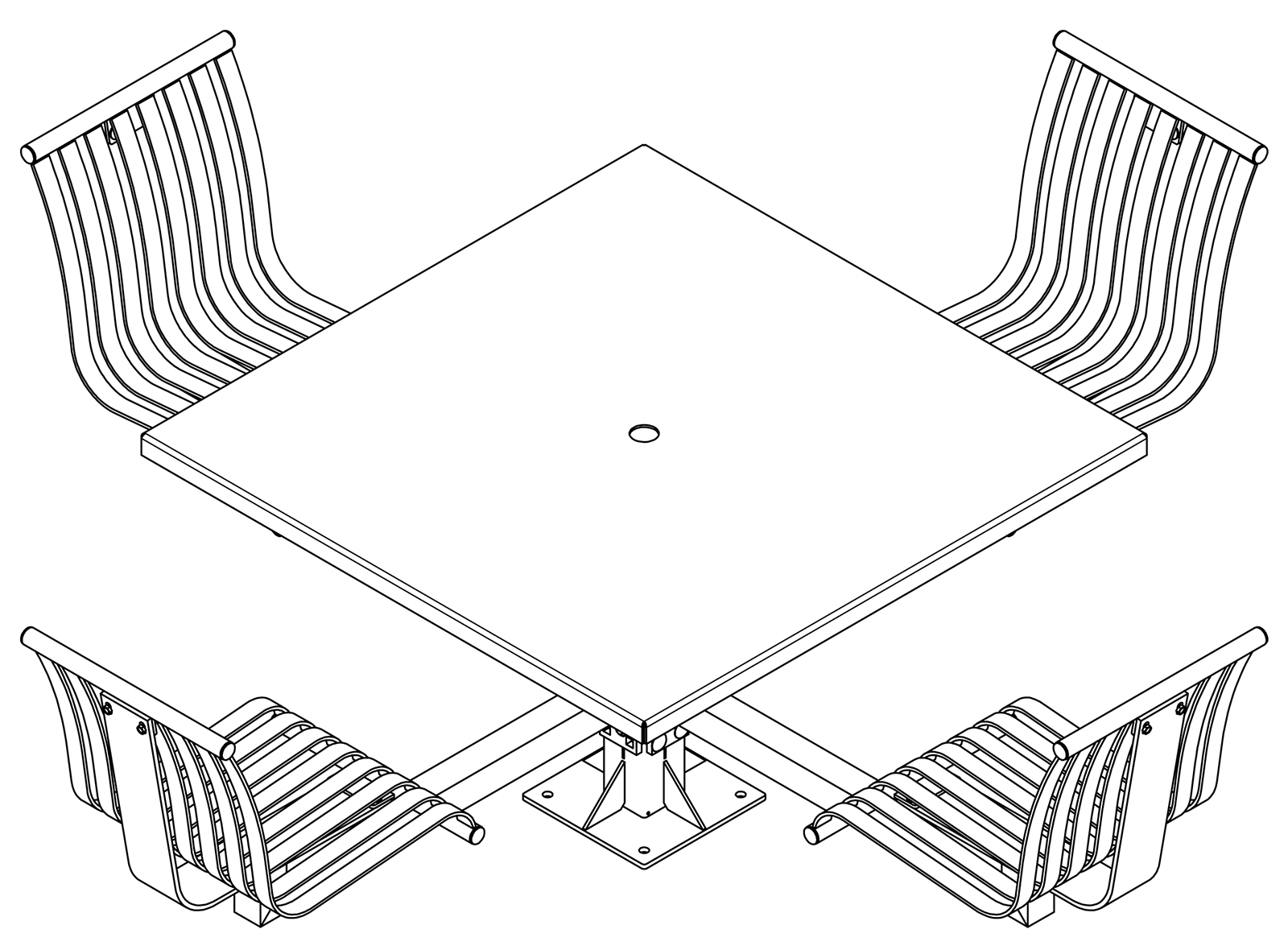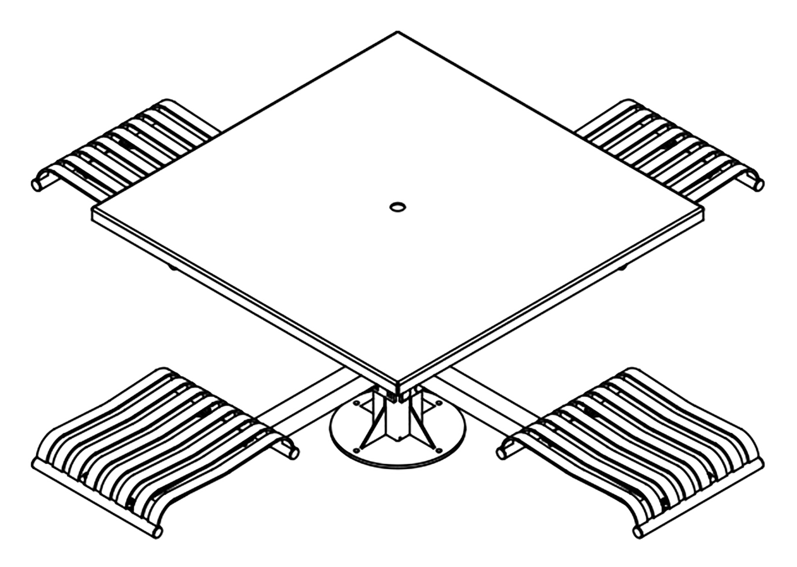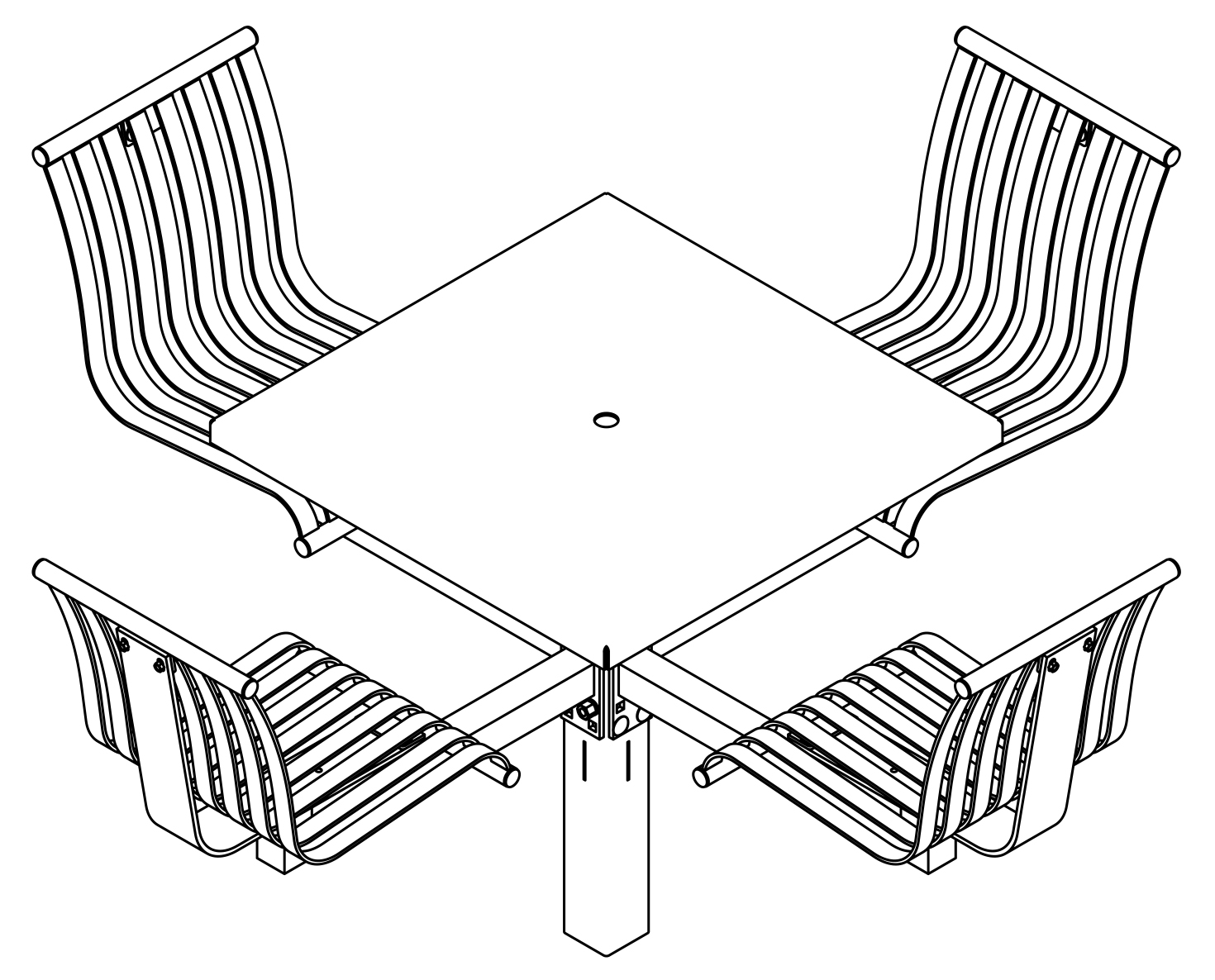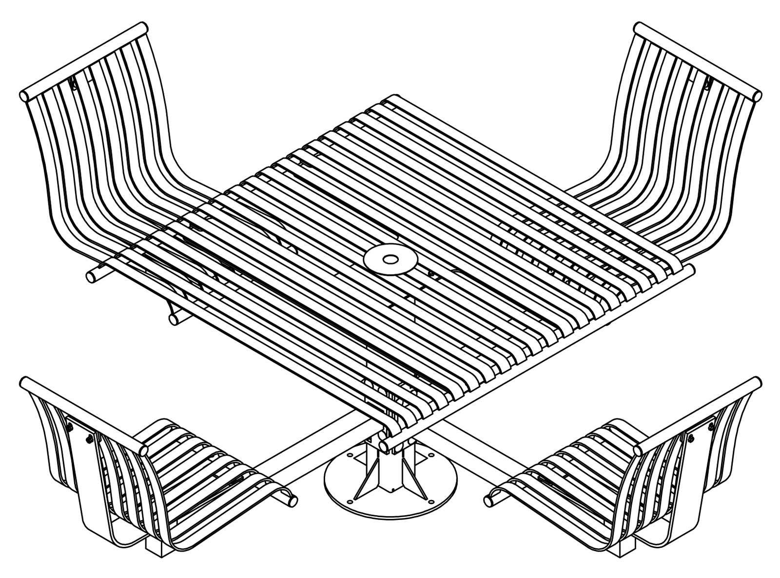 The CityView carousel tables provide clustered seating options for any patio setting. Chairs are permanently fixed to tables with support tubes that attach to the center post. CityView carousel tables offer a wide variety of design features and include round, square, ribbon style or solid table tops and can be offered in several mounting options.