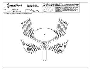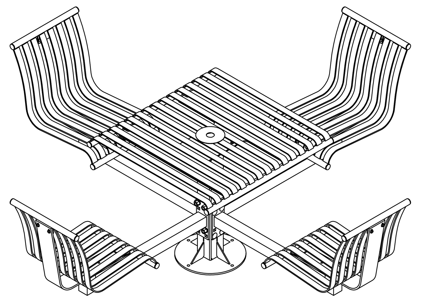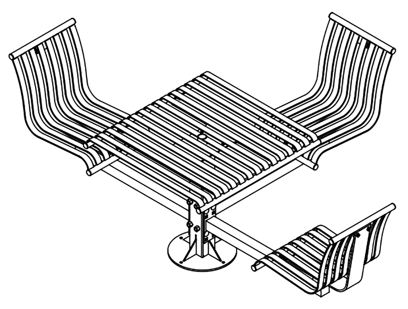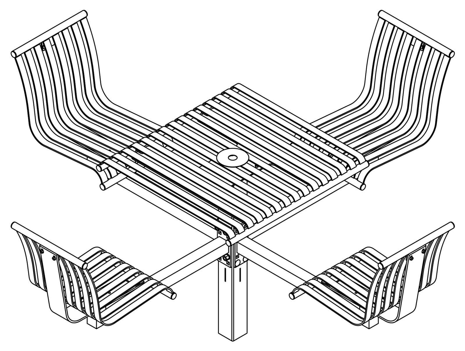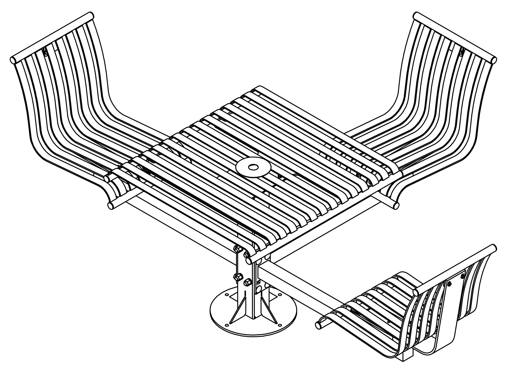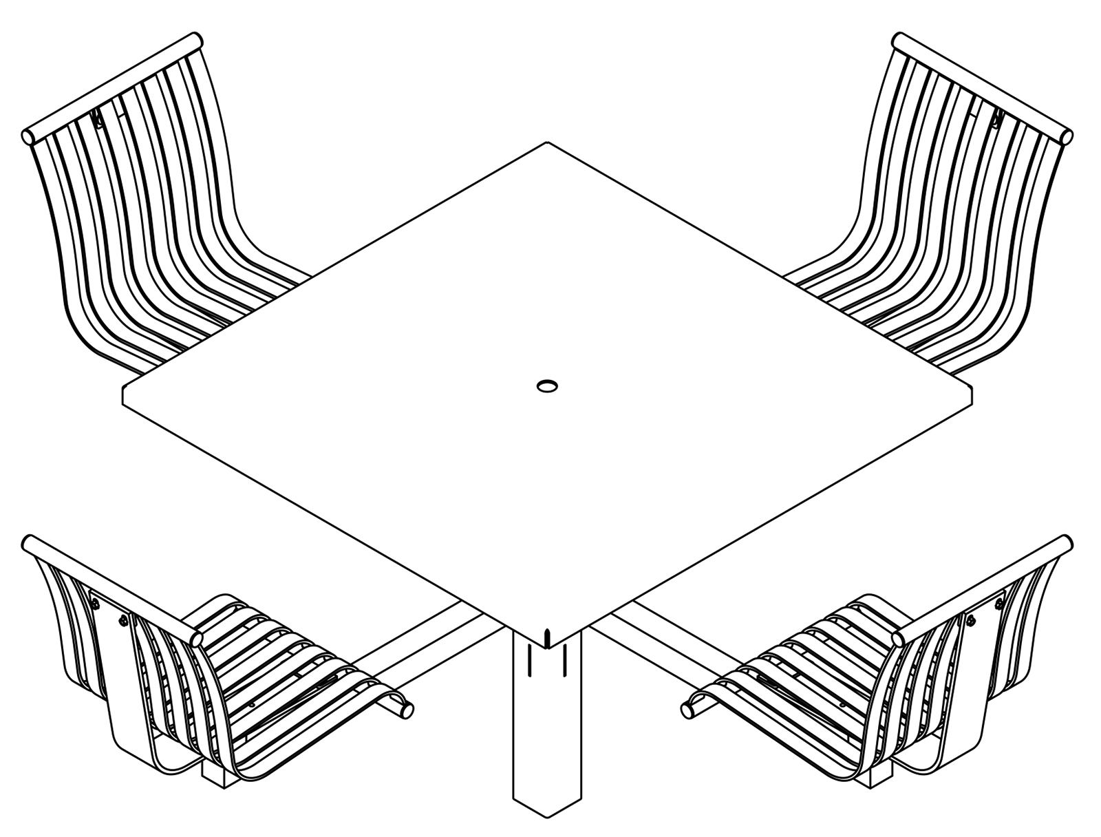 The CityView carousel tables provide clustered seating options for any patio setting. Chairs are permanently fixed to tables with support tubes that attach to the center post. CityView carousel tables offer a wide variety of design features and include round, square, ribbon style or solid table tops and can be offered in several mounting options.