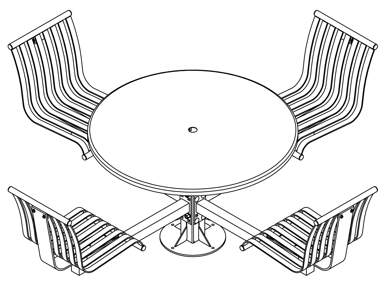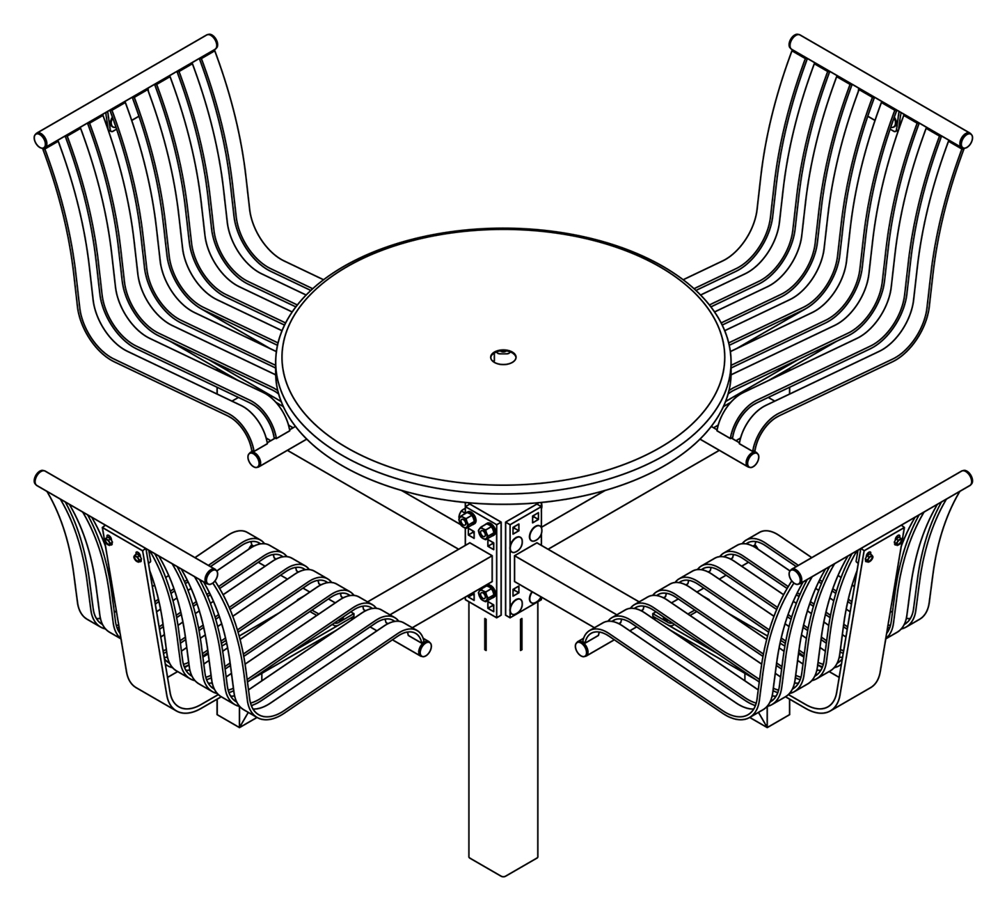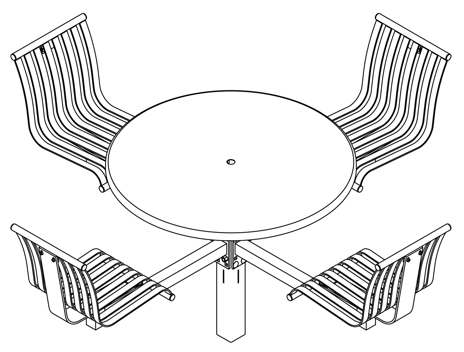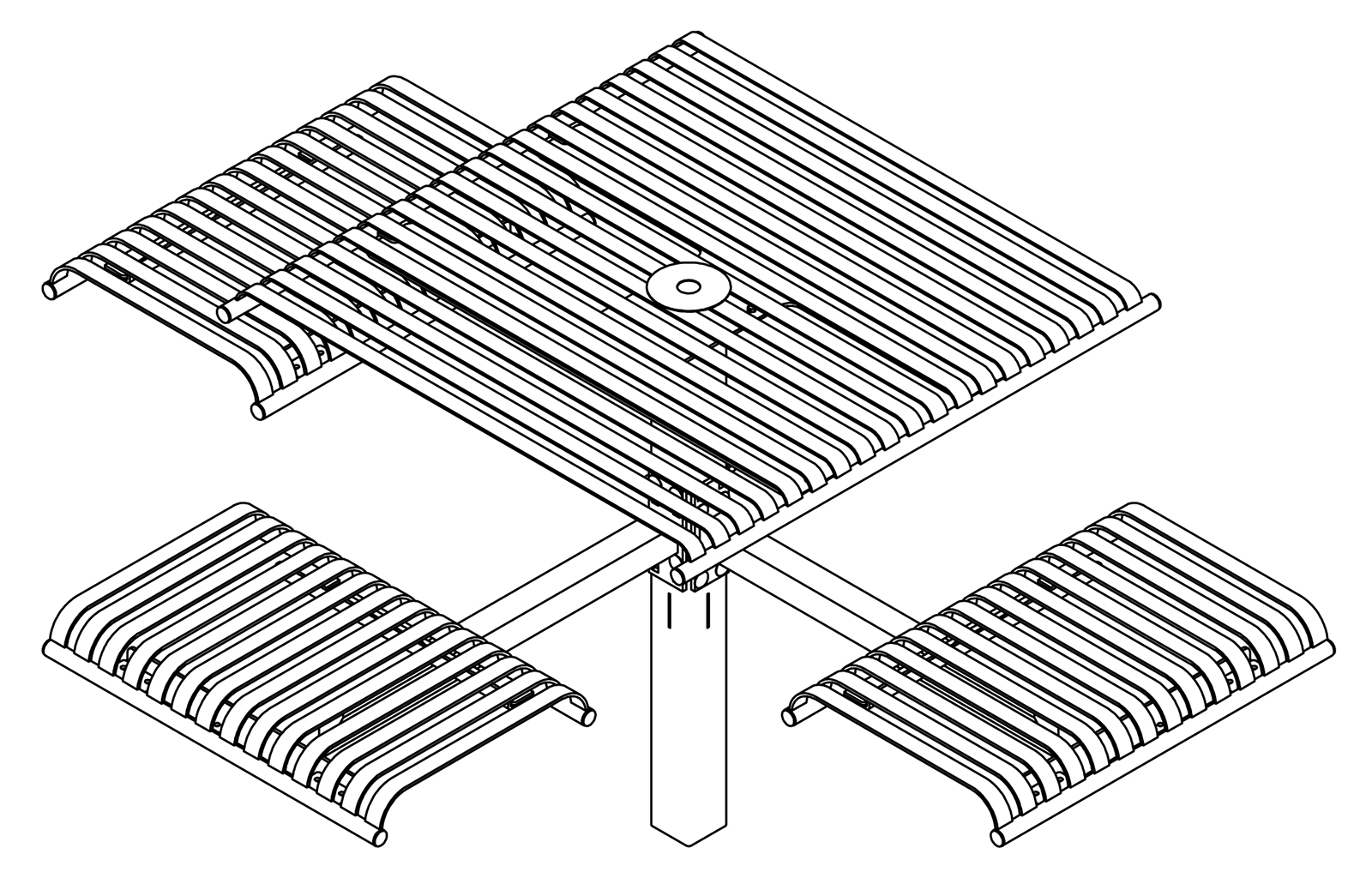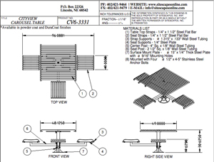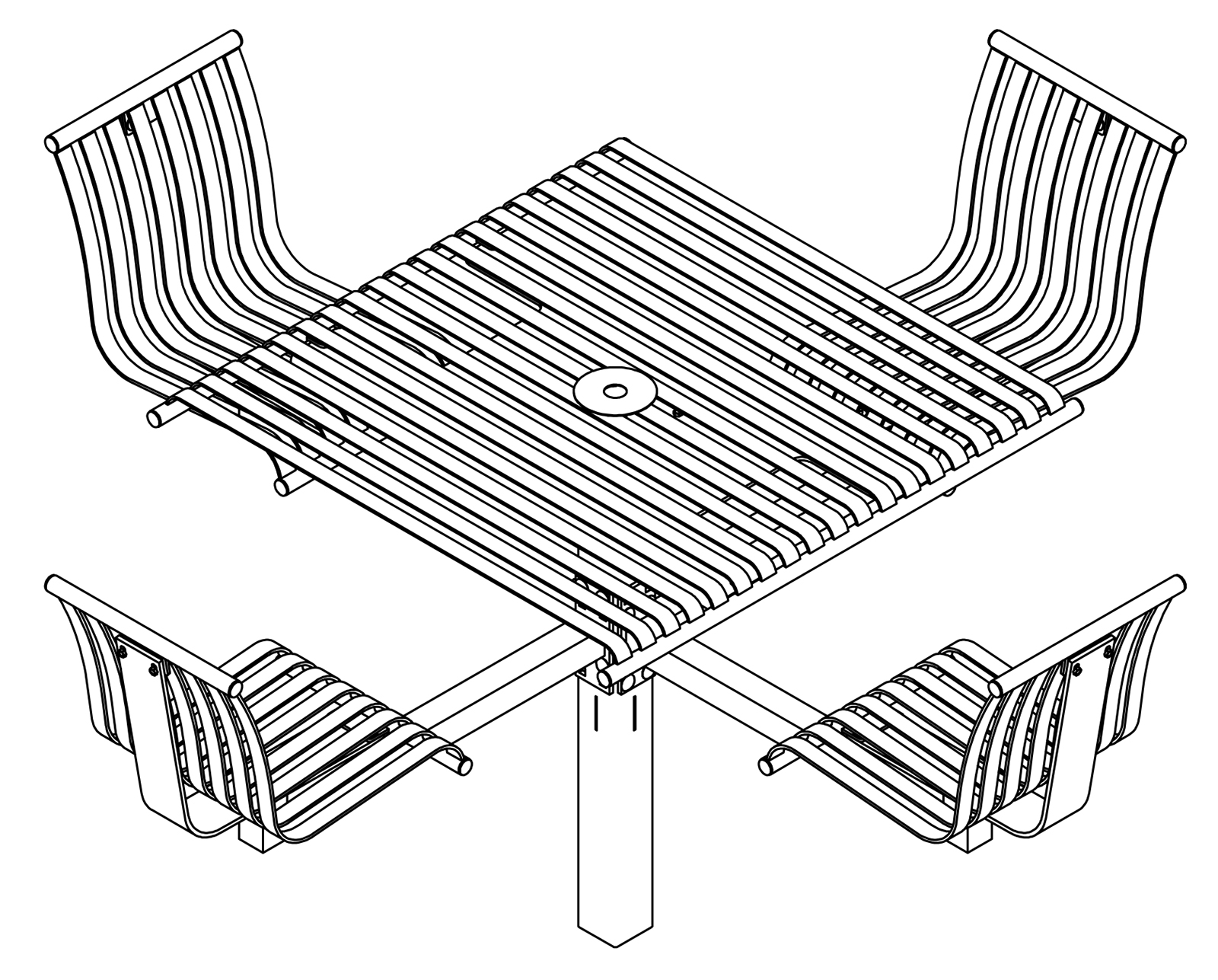 The CityView carousel tables provide clustered seating options for any patio setting. Chairs are permanently fixed to tables with support tubes that attach to the center post. CityView carousel tables offer a wide variety of design features and include round, square, ribbon style or solid table tops and can be offered in several mounting options.