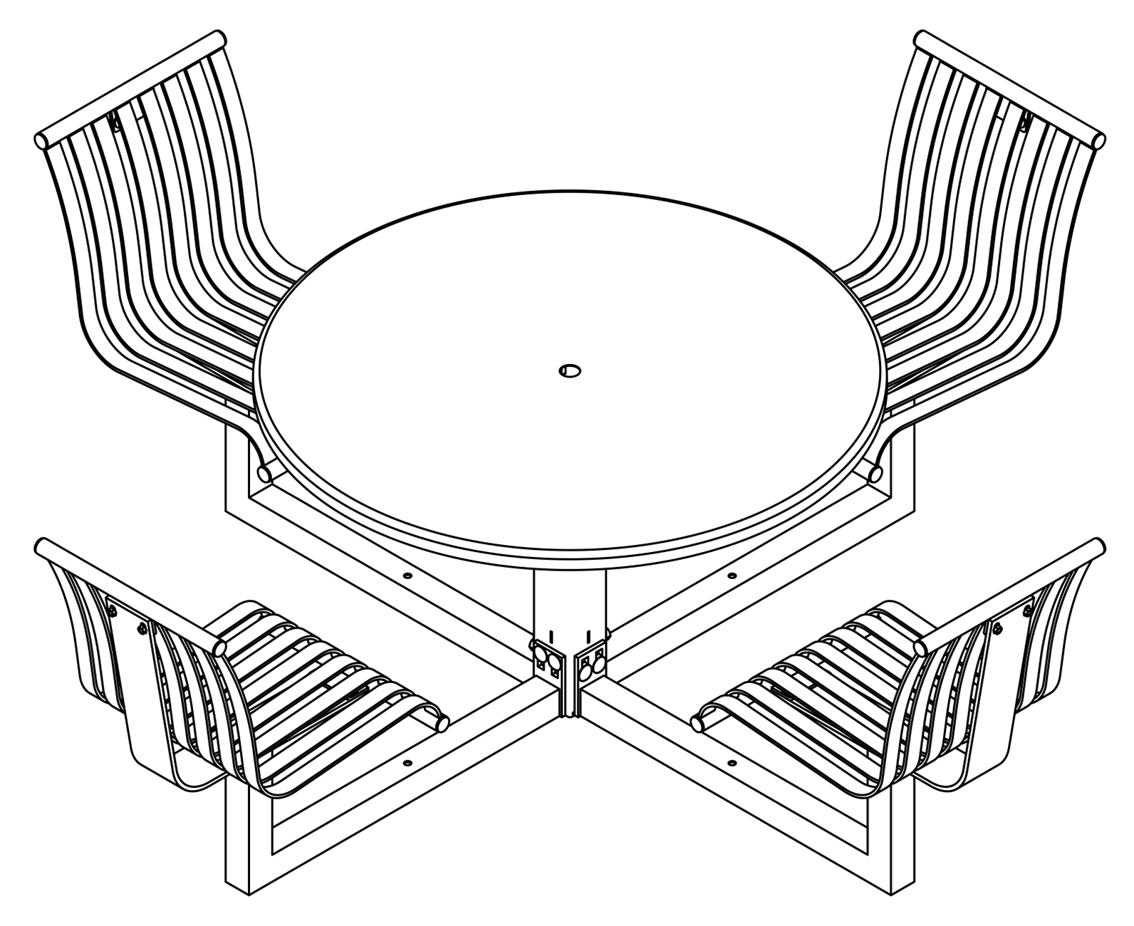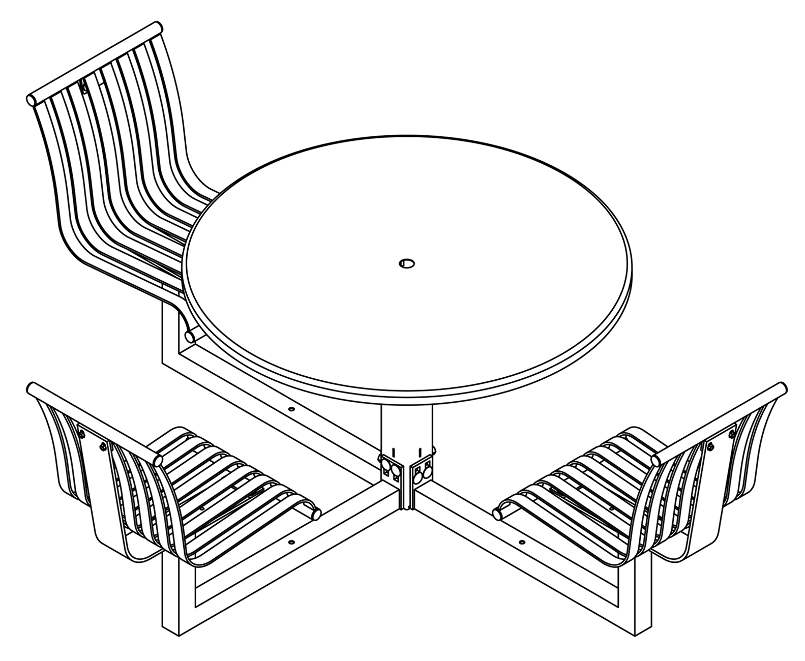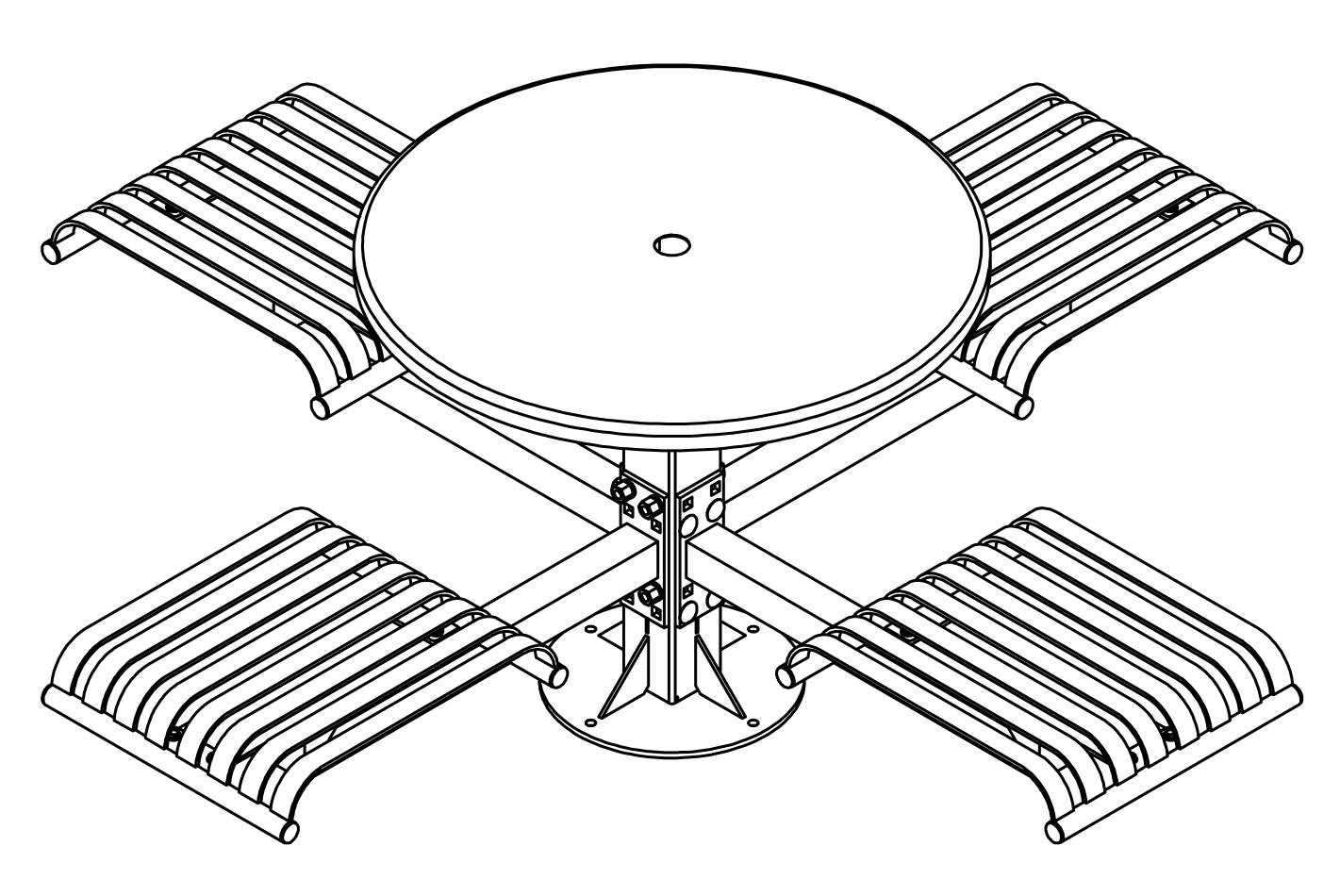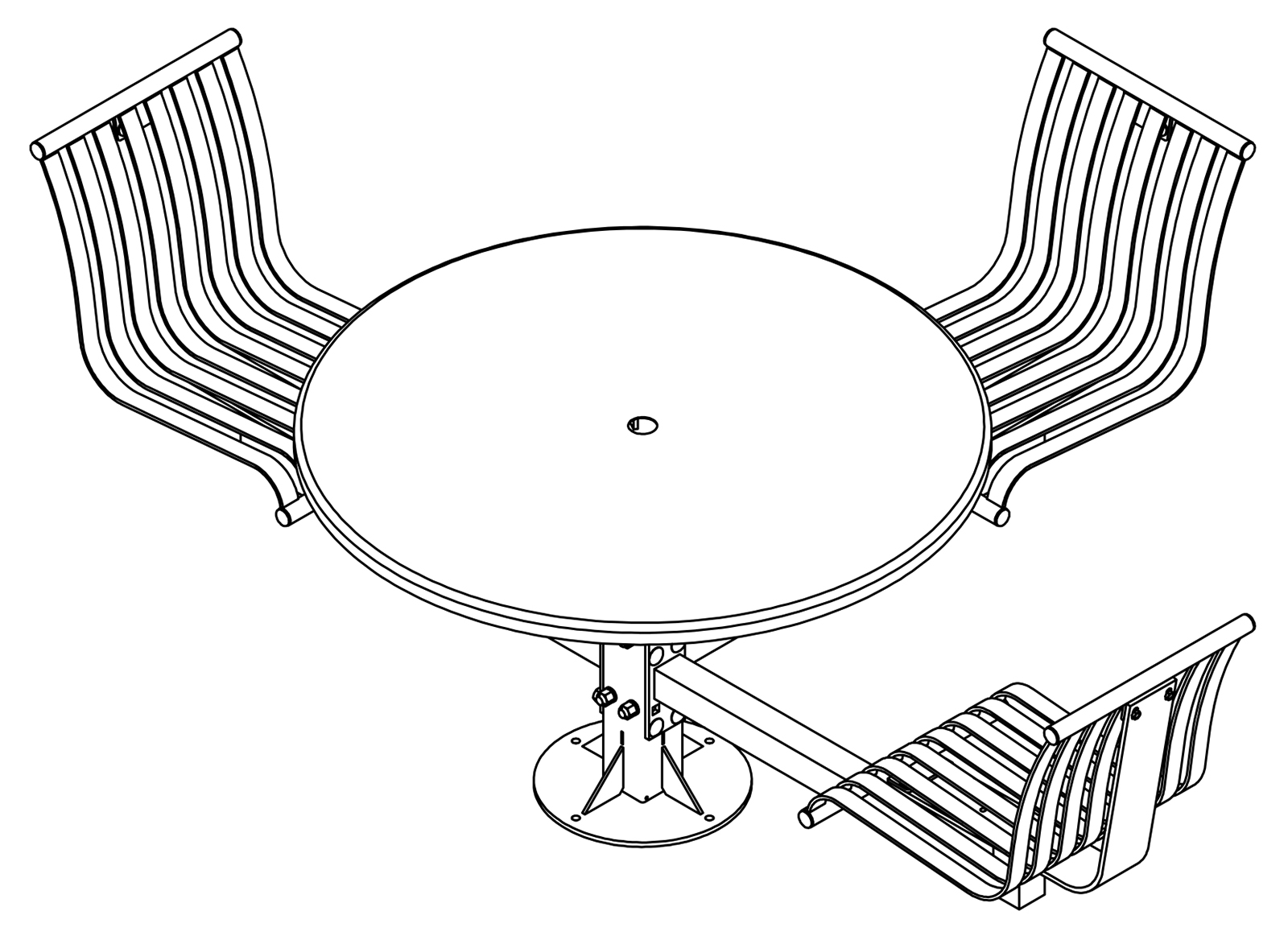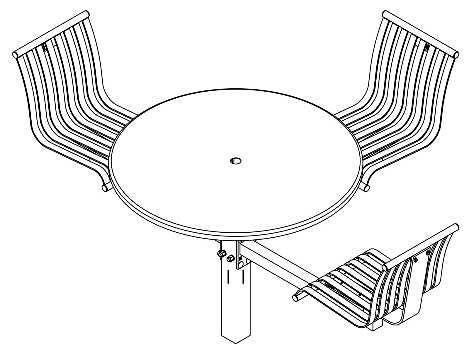 The CityView carousel tables provide clustered seating options for any patio setting. Chairs are permanently fixed to tables with support tubes that attach to the center post. CityView carousel tables offer a wide variety of design features and include round, square, ribbon style or solid table tops and can be offered in several mounting options.