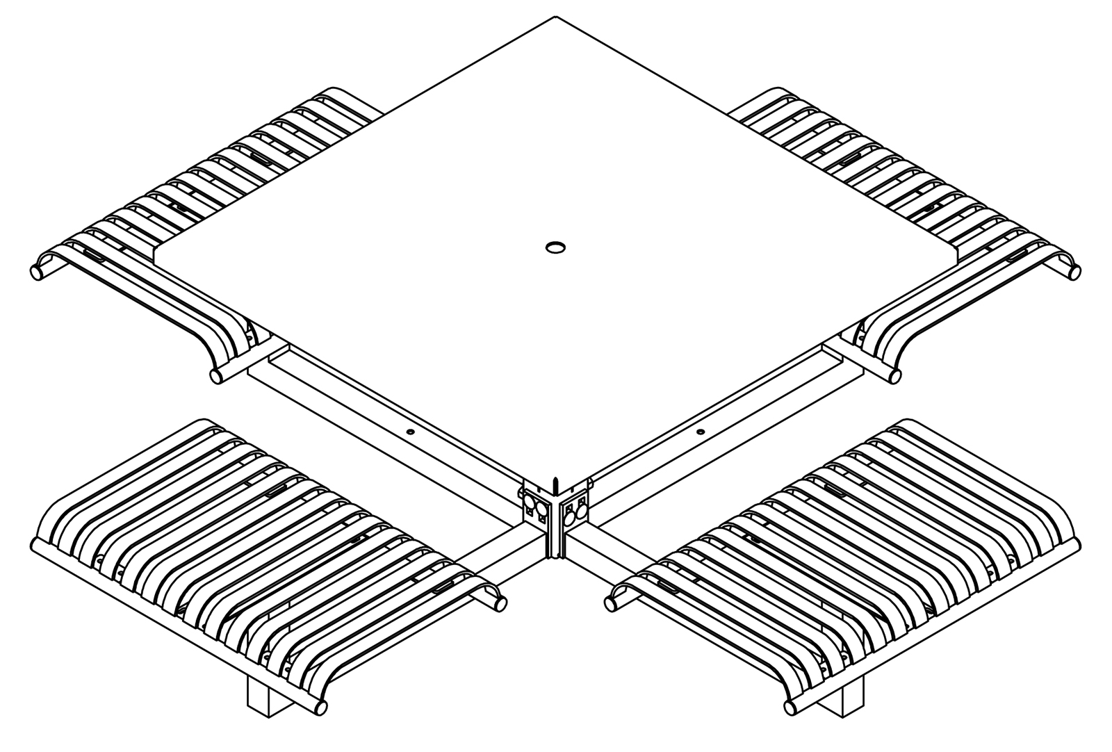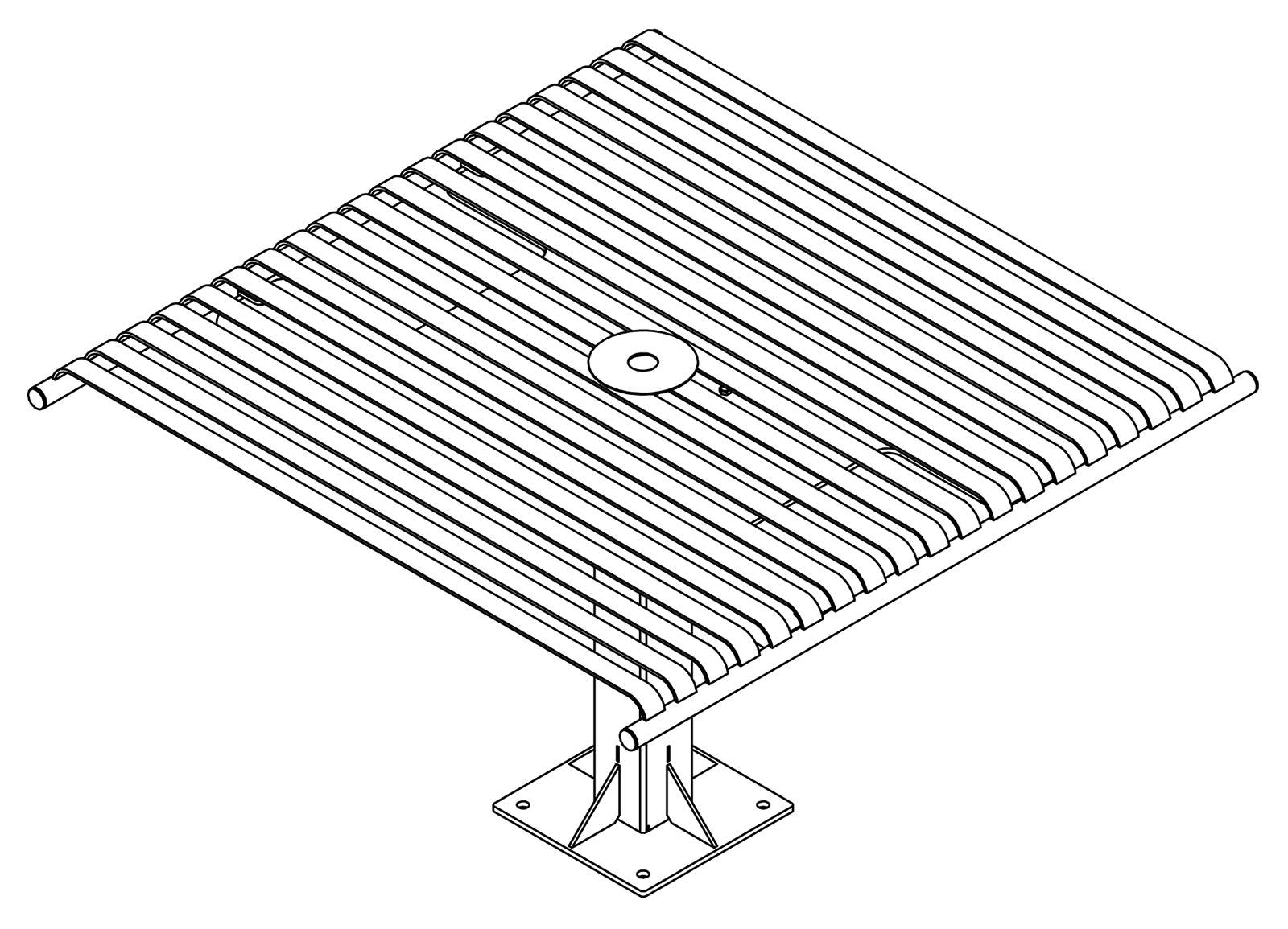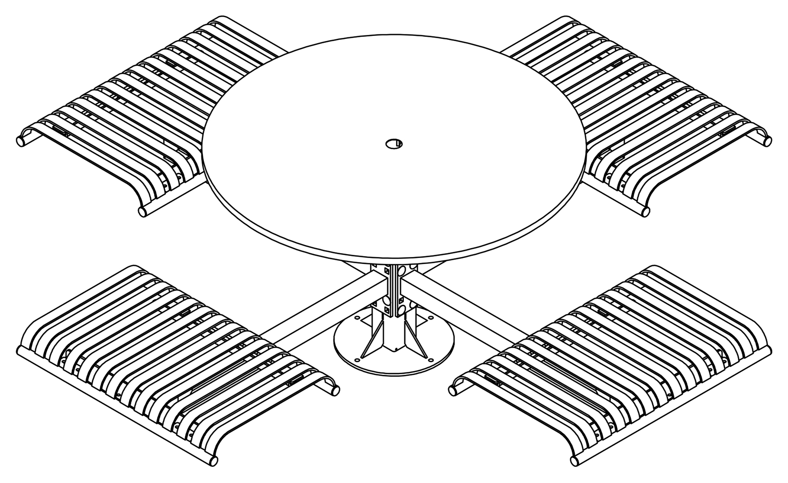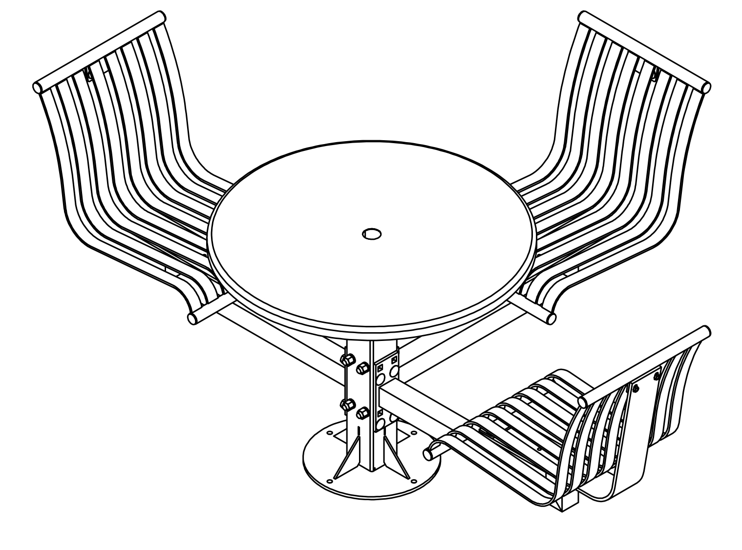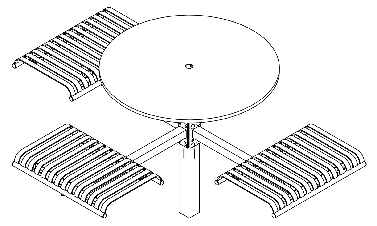 The CityView carousel tables provide clustered seating options for any patio setting. Chairs are permanently fixed to tables with support tubes that attach to the center post. CityView carousel tables offer a wide variety of design features and include round, square, ribbon style or solid table tops and can be offered in several mounting options.