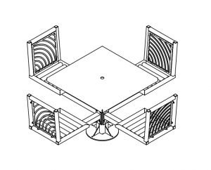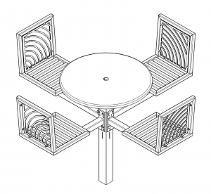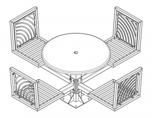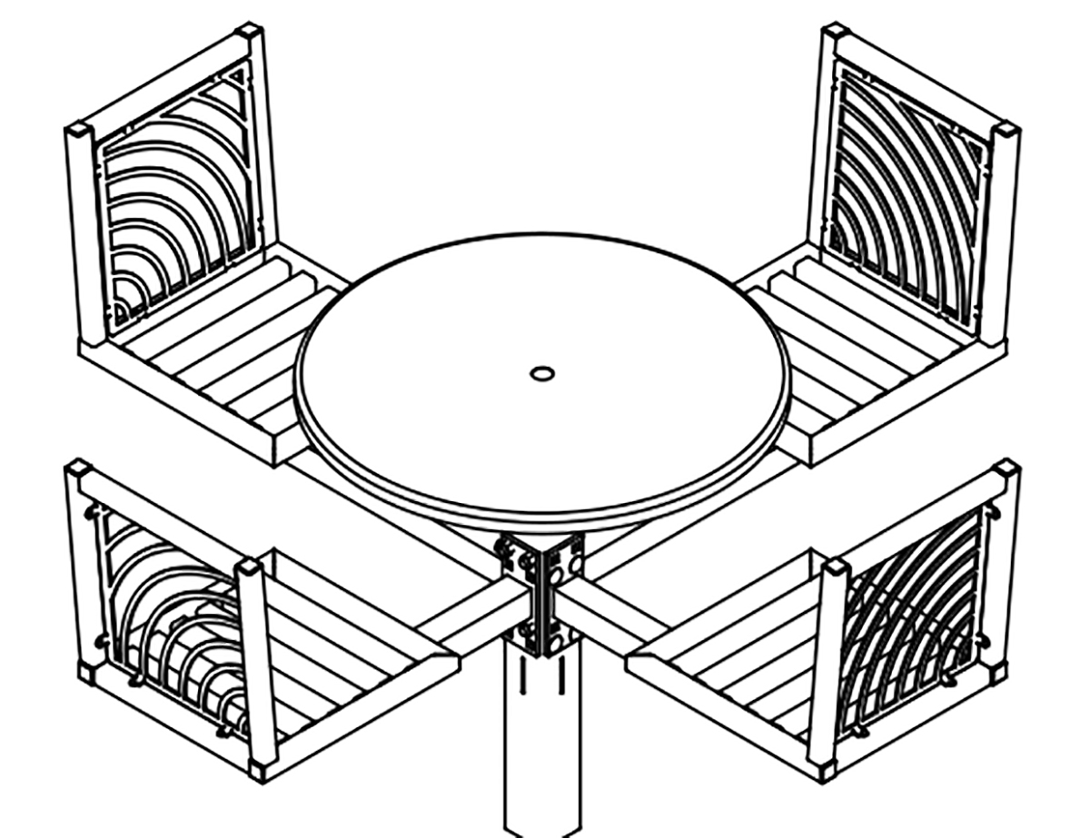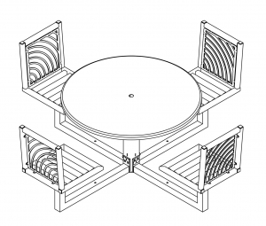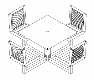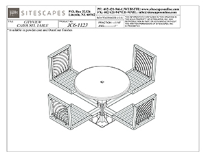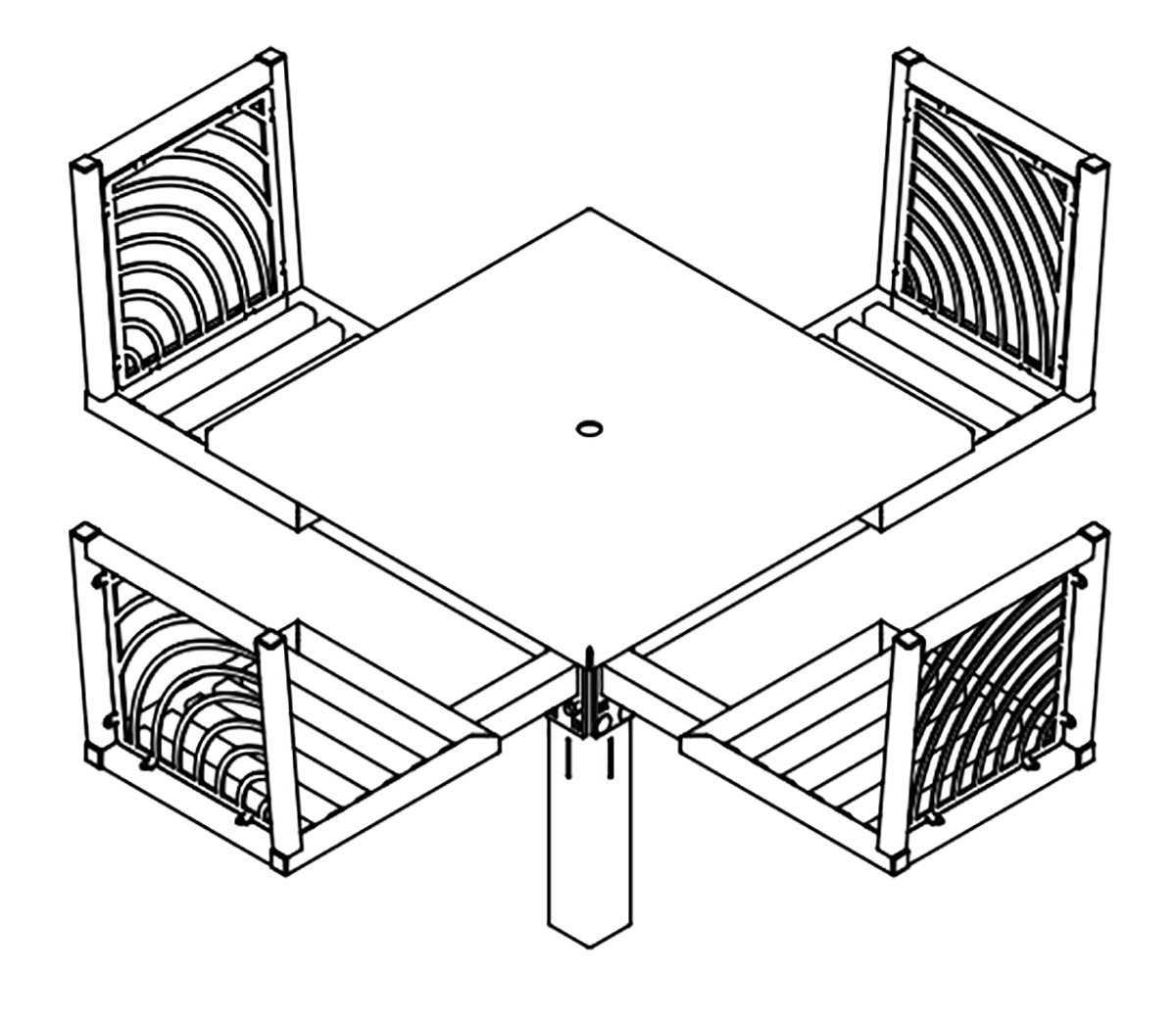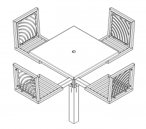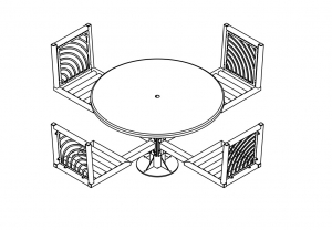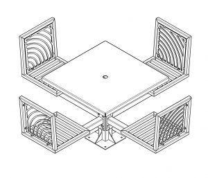 JordanCreek tables utilize the signature intricate laser cut panels and square tubing that are standard throughout the furniture collection. Chair patterns are laser-cut and can be customized to included neighborhood logos or simple graphics.
