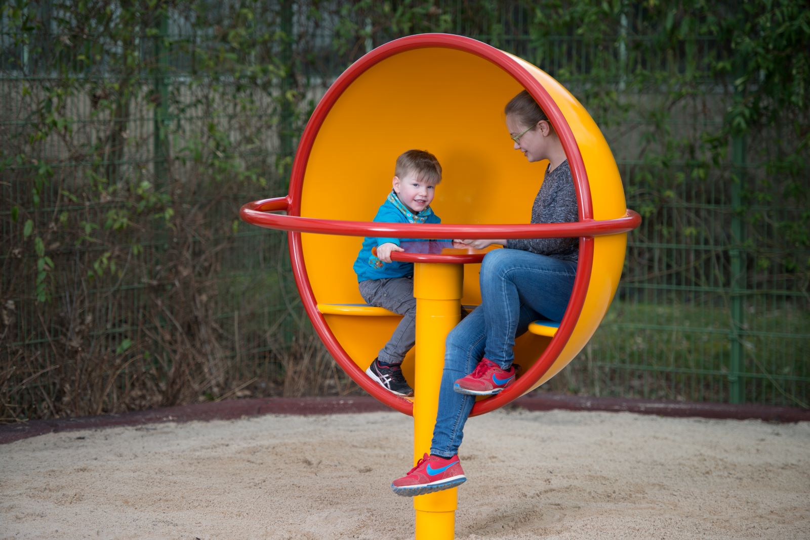 Take a cozy spin in the Gazebo. Ideal for individual or group spinning. The unique spinning action happens at the center of the Gazebo by pulling and pushing on the inside wheel.