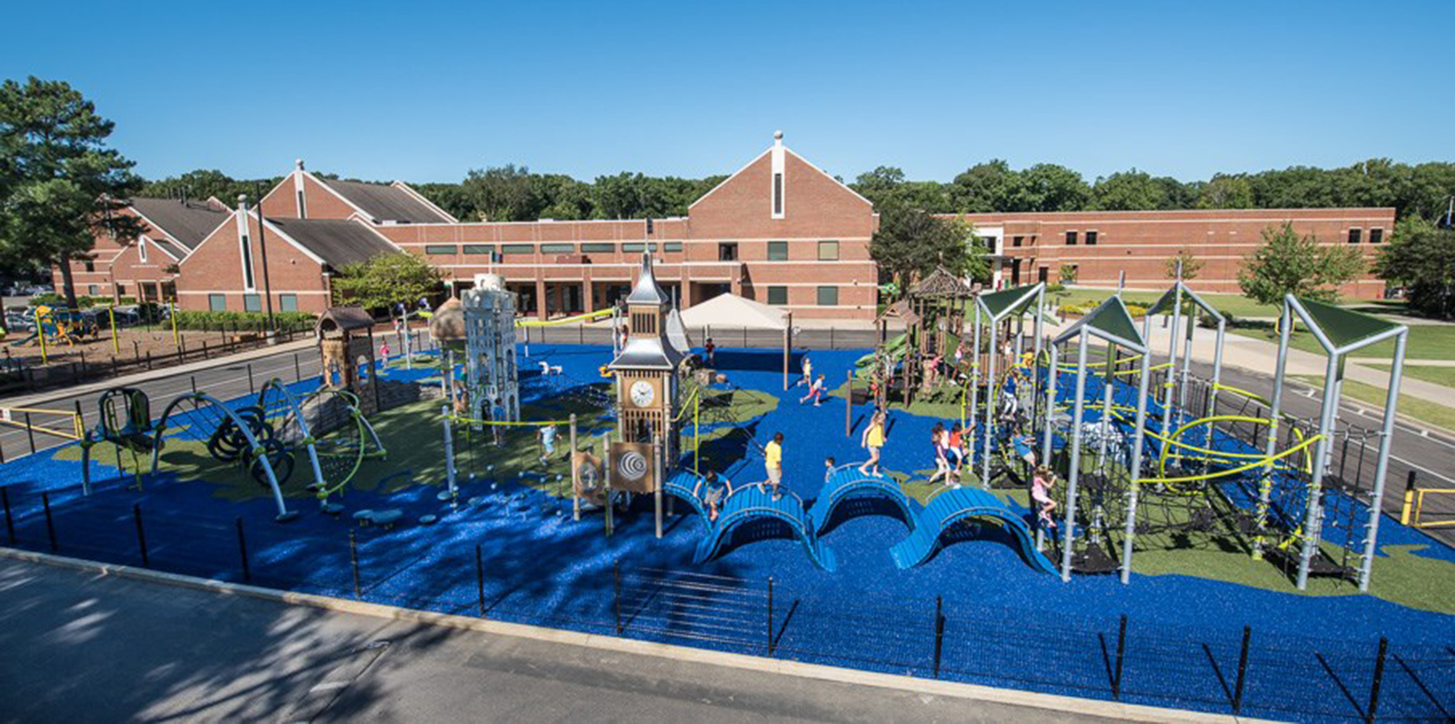 Lausanne Collegiate School includes 14 different playstructures that represent a tour of the world on safety surfacing designed to mimic a world map. Students travel from Cape Horn, South America, to the Great Wall of China without touching the ground, traveling through six continents and interacting with seven monuments with the flags of 18 different countries flying above. The playground includes the ZipKrooz™, a playground zip line, which takes students from the Horn of Africa to Australia. Even more, climbable replicas of Big Ben, the Eiffel Tower and the Taj Mahal provide opportunities for kids to interact, engage in imaginative play and discover the work beyond them while staying active. Smart Play®: Motion, with its compact design and 16 activities, was the perfect playground equipment addition for kids ages 2 to 5.