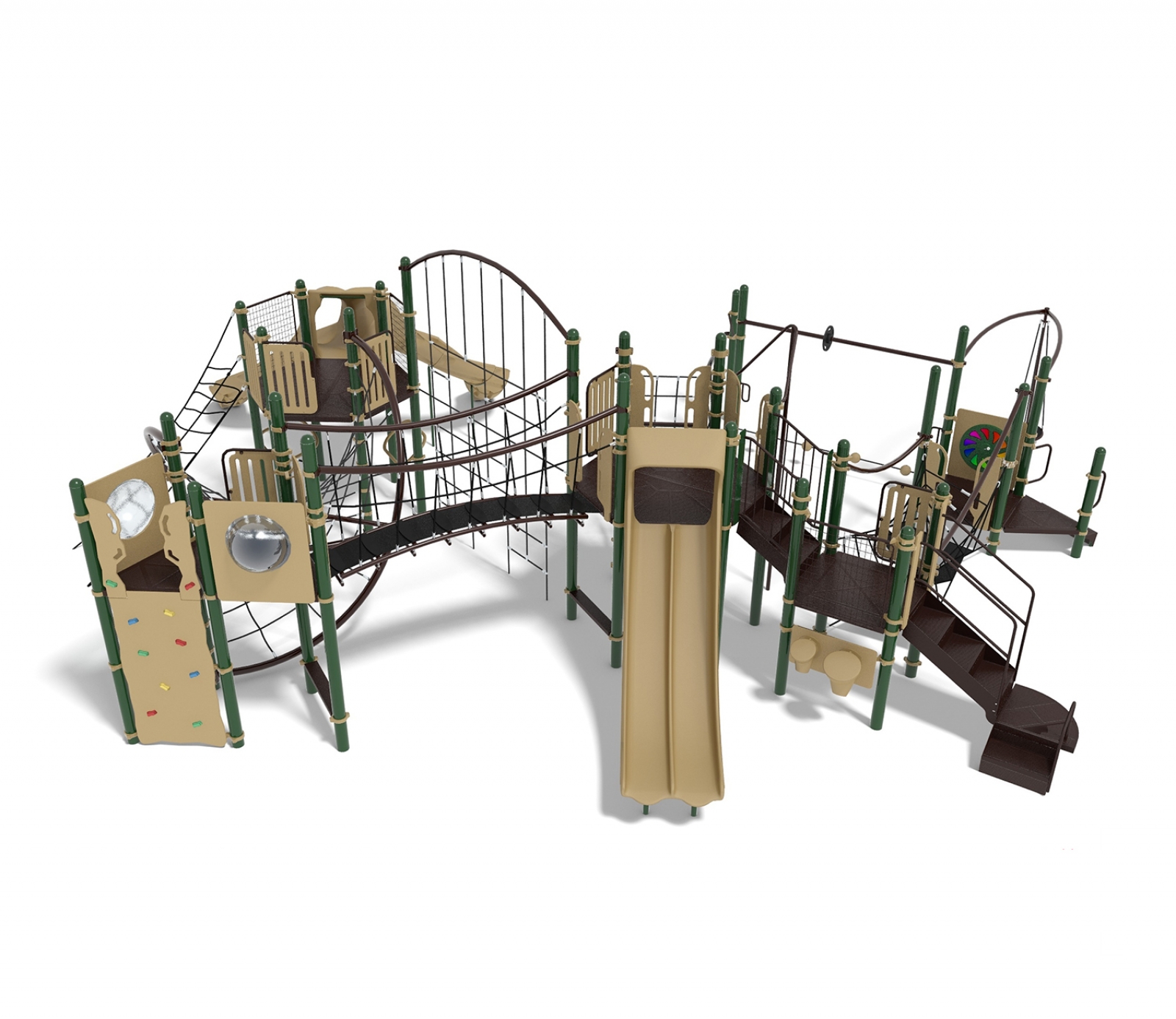 The PlayBooster playground structure, the original post-and-clamp system, combines exciting ground-level components with climbing events and overhead activities for kids ages 5 to 12. The PlayBooster family includes the interconnected cables of Netplex, the contemporary Vibe, the nature-inspired Tree House and the double-decker PlayOdyssey Tower.