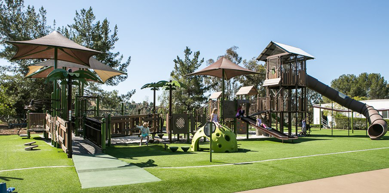 Students at Curtis School in Los Angeles, Calif., are connected with nature during recess each day. The school is home to a nature-inspired playground with PlayOdyssey® Tower, Netplex® and PlayBooster® playstructures. Elements like Palm Tree Accent post toppers, the custom tower roof and wood-grain panels provide more of the natural playground theme. In addition to the inclusive playground structures, freestanding playground components like the ZipKrooz™, Cozy Dome® and OmniSpin® spinner deliver more sensory-rich play experiences.