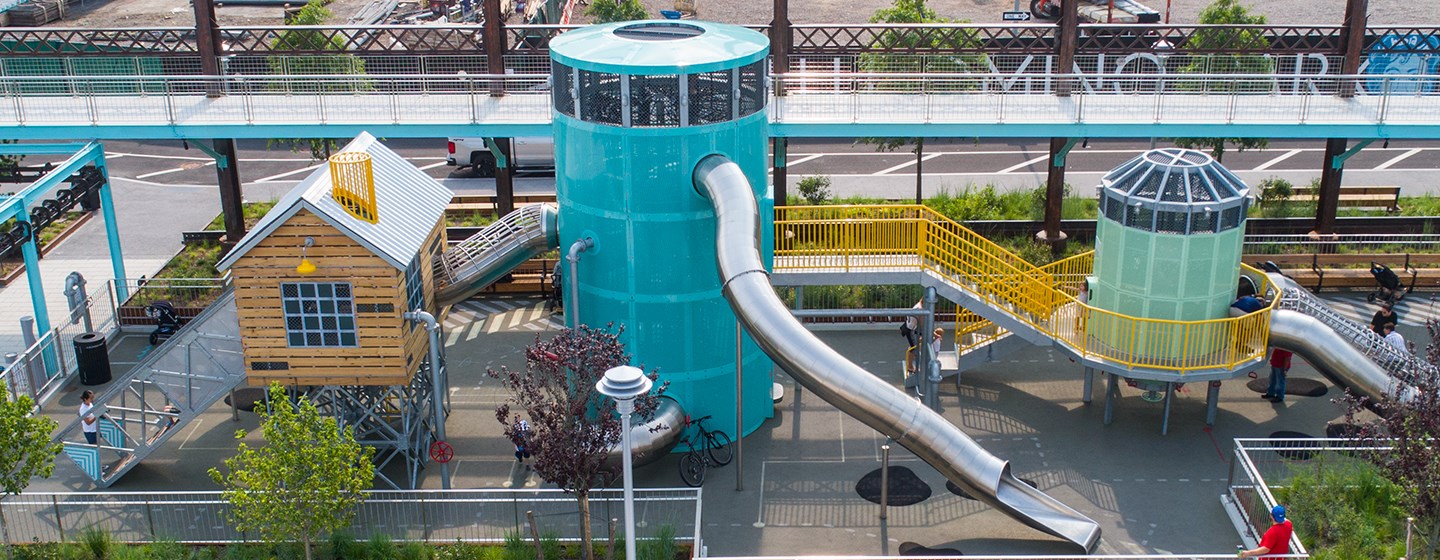Inspired by artist Mark Reigelman's interpretation of the historic Domino Sugar Factory, Landscape Structures designed it into playable reality. An intricate web of belting, nets and climbers lets kids scramble from the sugar shack up to the masher tower and over to the centrifuge. Stainless steel slides look just like industrial pipes. Casts of original factory valves are scattered throughout. And some of the wood was reclaimed from the original sugar shack, giving kids a tactile connection to history.