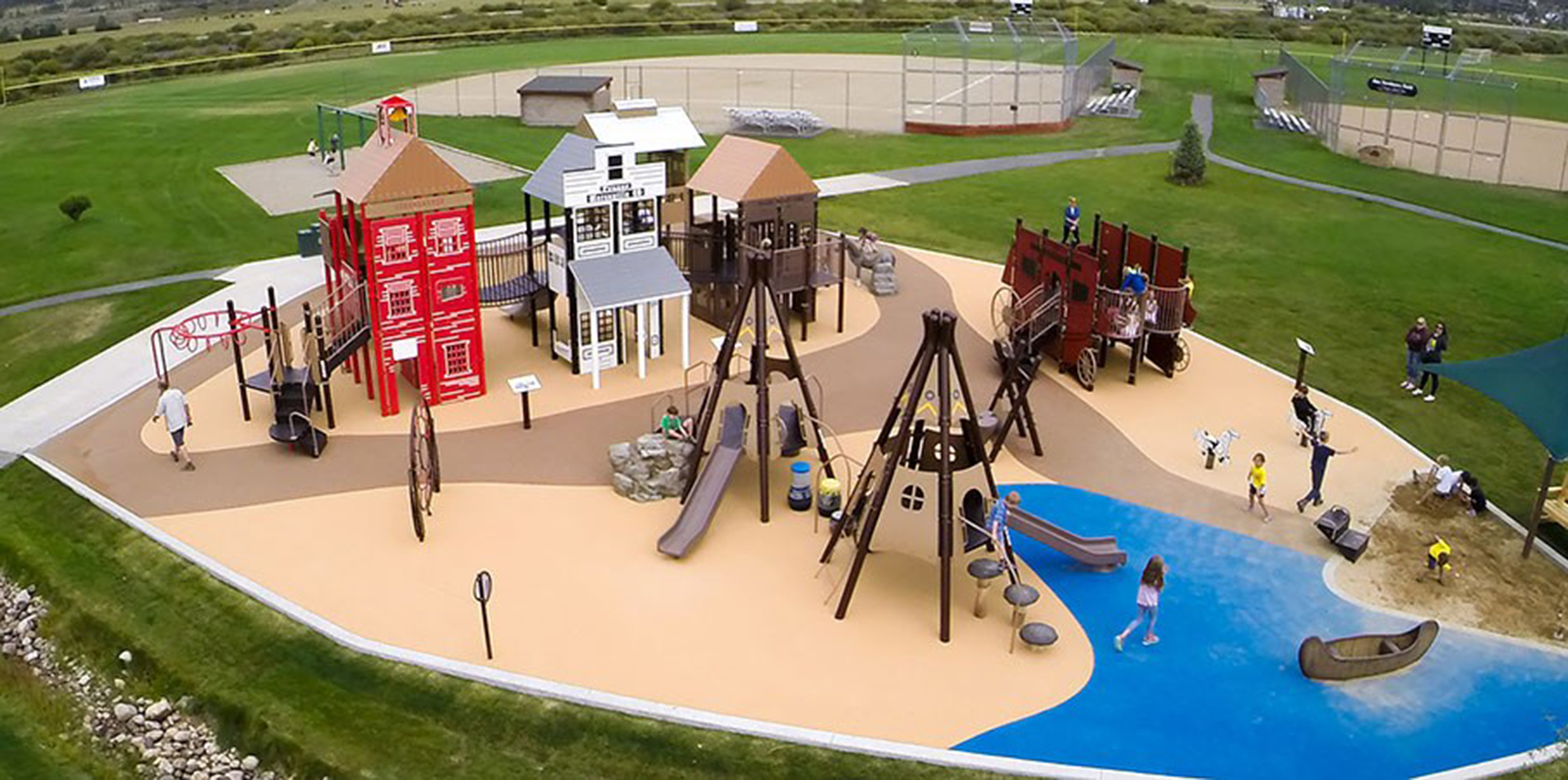 This Western-themed playground is a PlayBooster® structure customized with Permalene® panels that bring the storefronts and stagecoach to life. There are plenty of activity options from the PlayBooster Ring-a-Ling™ Overhead Event to our Rollerslide, which brings a cool, sensory and inclusive play experience to kids of all abilities. Another fun feature of this playground is the realistic horse and canoe Glass Fiber Reinforced Concrete (GFRC) sculpture where children can pretend they're voyaging to another era.