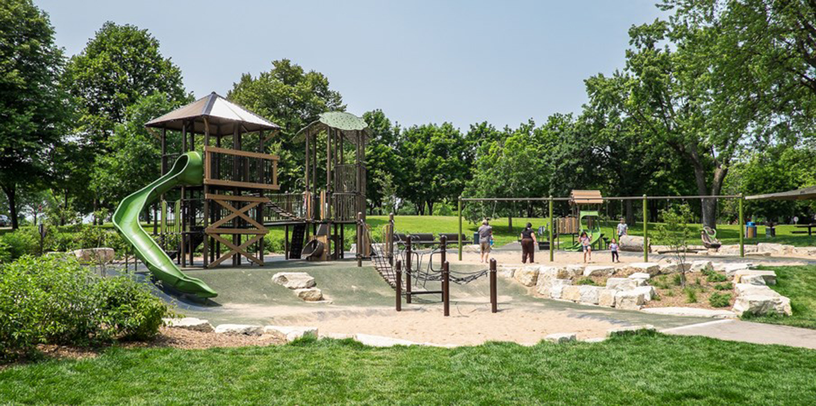 This nature-themed playground design will delight children of all ages. A customized tower constructed from the PlayBooster® product line gives kids a birds-eye view of the happenings on the ground level of the playground and leaf-like roof panels encourage imaginative play among 5- to 12-year-olds. For younger explorers, a tree house PlayShaper® play structure was included along with many nature-inspired play components like the Log Tunnel and Log Balance Beam. Even more, swings--a playground favorite--were included in the design to deliver the feel of flying through the air.