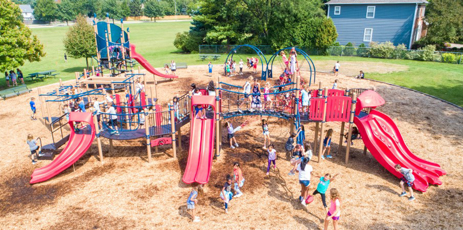 The school playground at River Woods Elementary will keep students ages 5 to 12 wishing for more recess. An 8' Super Netplex® tower brings height to the playground design along with playground climbing nets and a thrilling ride down the 96" Double Swoosh Slide®. The tower is play functionally linked to a PlayBooster® playstructure complete with overhead events, more climbers and slides, unique bridges and an Aeronet® climber. This sprawling school playground is completed with a Double Oodle® Swing for more play opportunities apart from the structure.