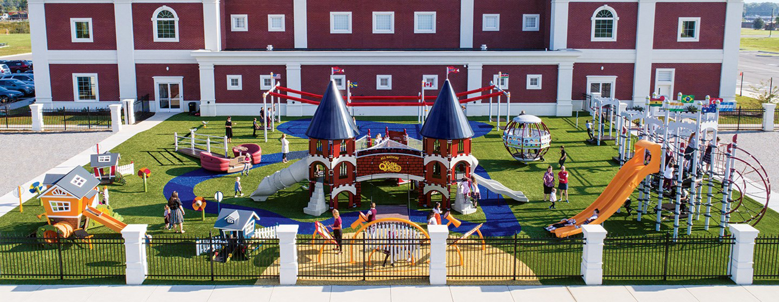 A castle-themed PlayBooster® play structure takes center stage in this playground design. That, combined with the nearby Netplex® play structure, and the selection of net climbers, bridges, slides and custom roofs make this play space a must-explore for kids ages 5 to 12. The Nook and Loft provides a space for kids ages 6 months to 5 years can safely play and interact with peers. Even more, the Rhapsody® Outdoor Musical Instruments add a harmonious dimension to the playground, while a freestanding Global Motion®, customized using DigiFuse® panels, and Sway Fun® glider deliver more play opportunities for kids.
