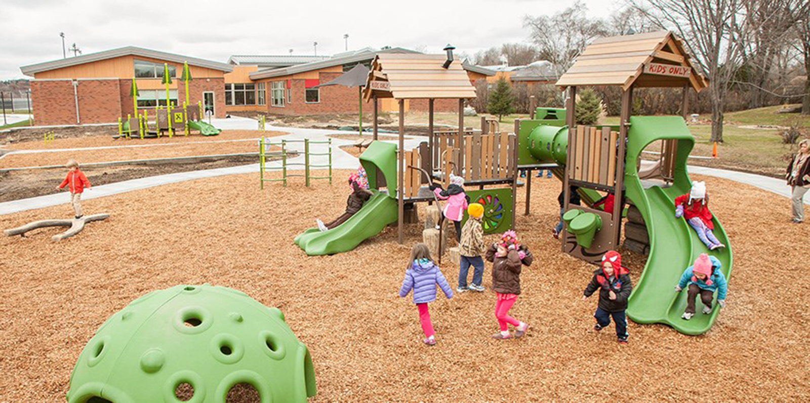 The nature-inspired playground in Stillwater, Minnesota, offers two play areas for outdoor fun—one for toddlers ages 2 to 5, and another just for little ones ages 6 to 23 months. Eye-catching sensory panels are near the ground, just the right height for the tiniest tots. Early walkers will appreciate the Infant Balance Bar. The Log Stack Climber provides the tactile feel of bark while encouraging toddlers' climbing skills on their way up to the "Kids Only" fort. A series of Permalene® trees and Acorn Seats round out the woodsy theme.