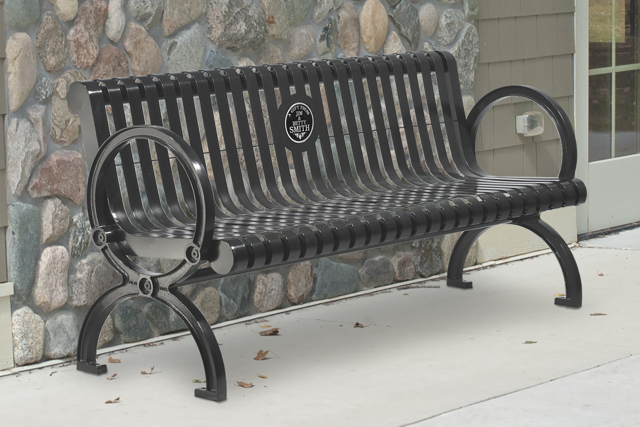 Pilot Rock's new Gillette Series Bench offers: cast iron frames, contour or flat seating, seats of recycled plastic, hardwood or powder coated steel, many color choices, 3 lengths.