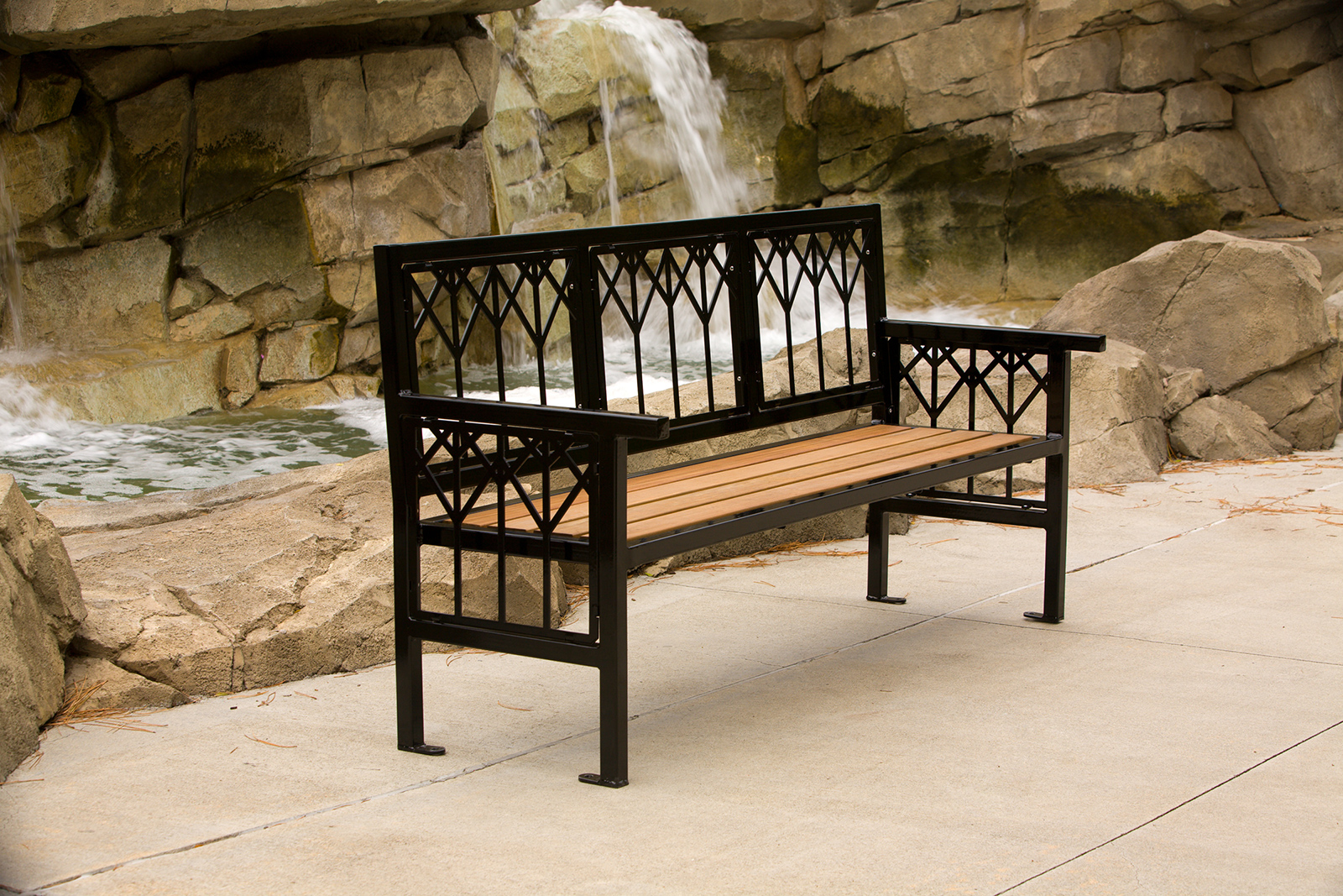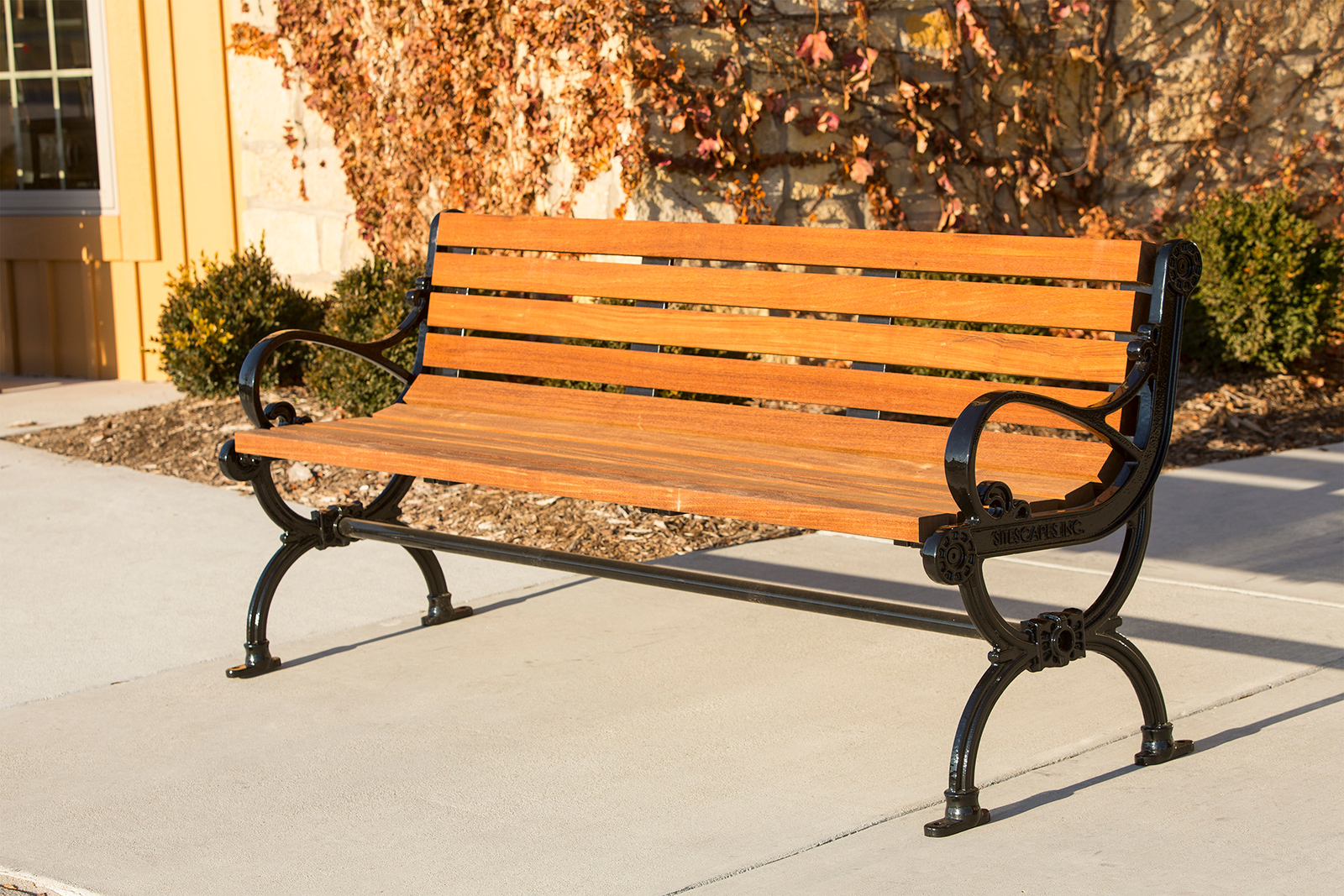 Arlington wood benches utilize an Ipe wood slat seating surface while maintaining the signature heritage decorative Arlington cast end. This Victorian bench is perfect for traditional or historic projects.