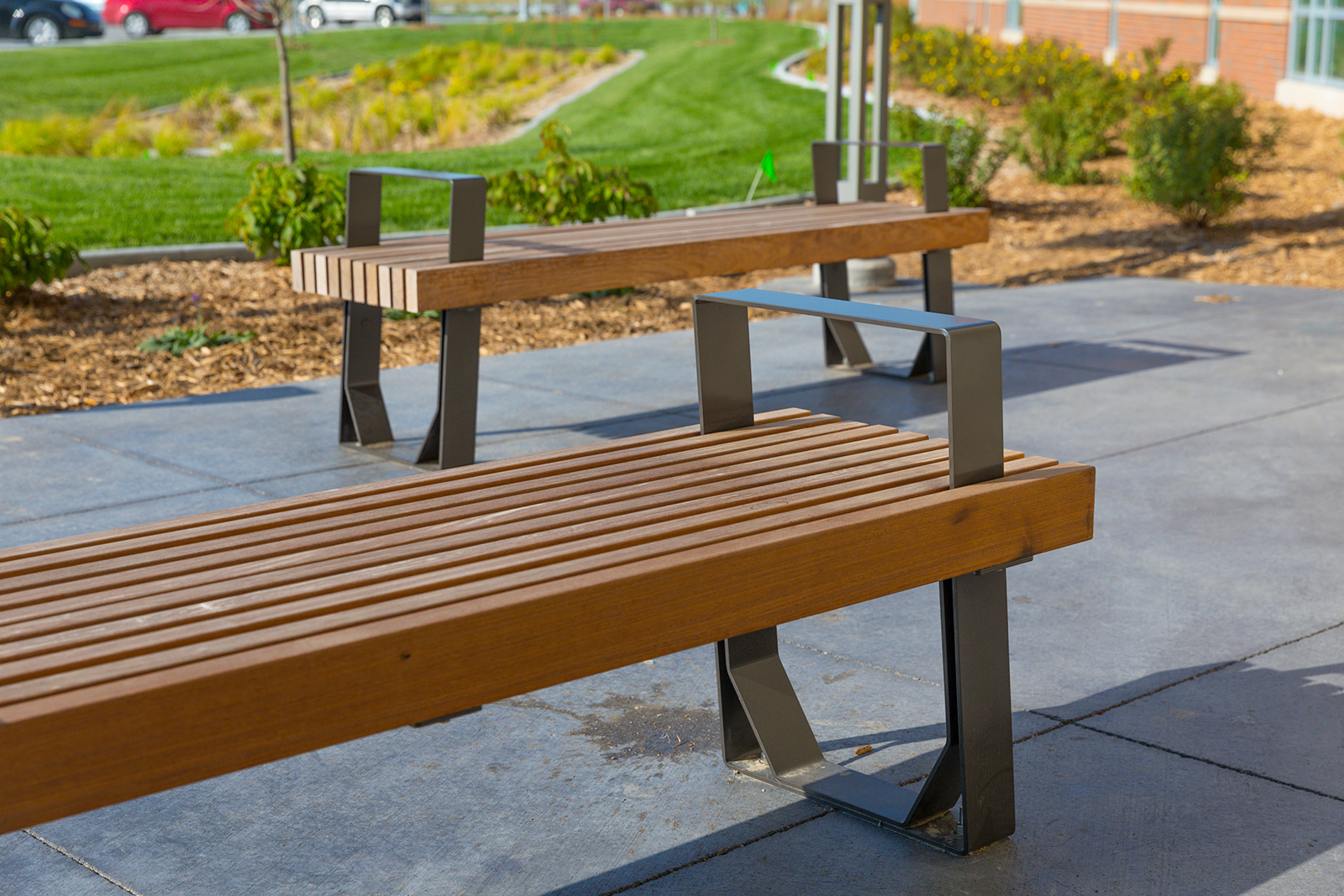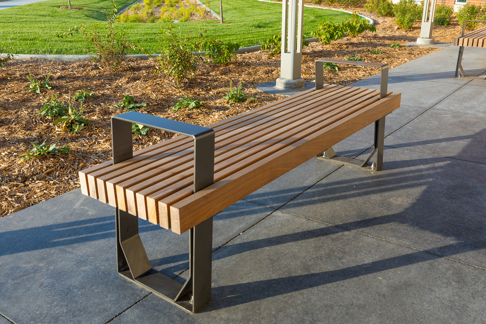 The FUSE park bench is a simple fusion of materials with a contemporary feel. The seat surface utilizes Ipe hardwood, while the bench ends and back are constructed of durable steel plate with rounded contours giving it a modern figure.