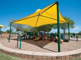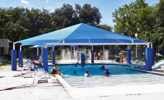 Sun Ports goes cool blue with this fabric structure at a Dallas pool. The Custom Hexagon is a dazzling 48- footer that provides plenty of shade for the splash area. The padded steel posts serve as an extra safety feature.