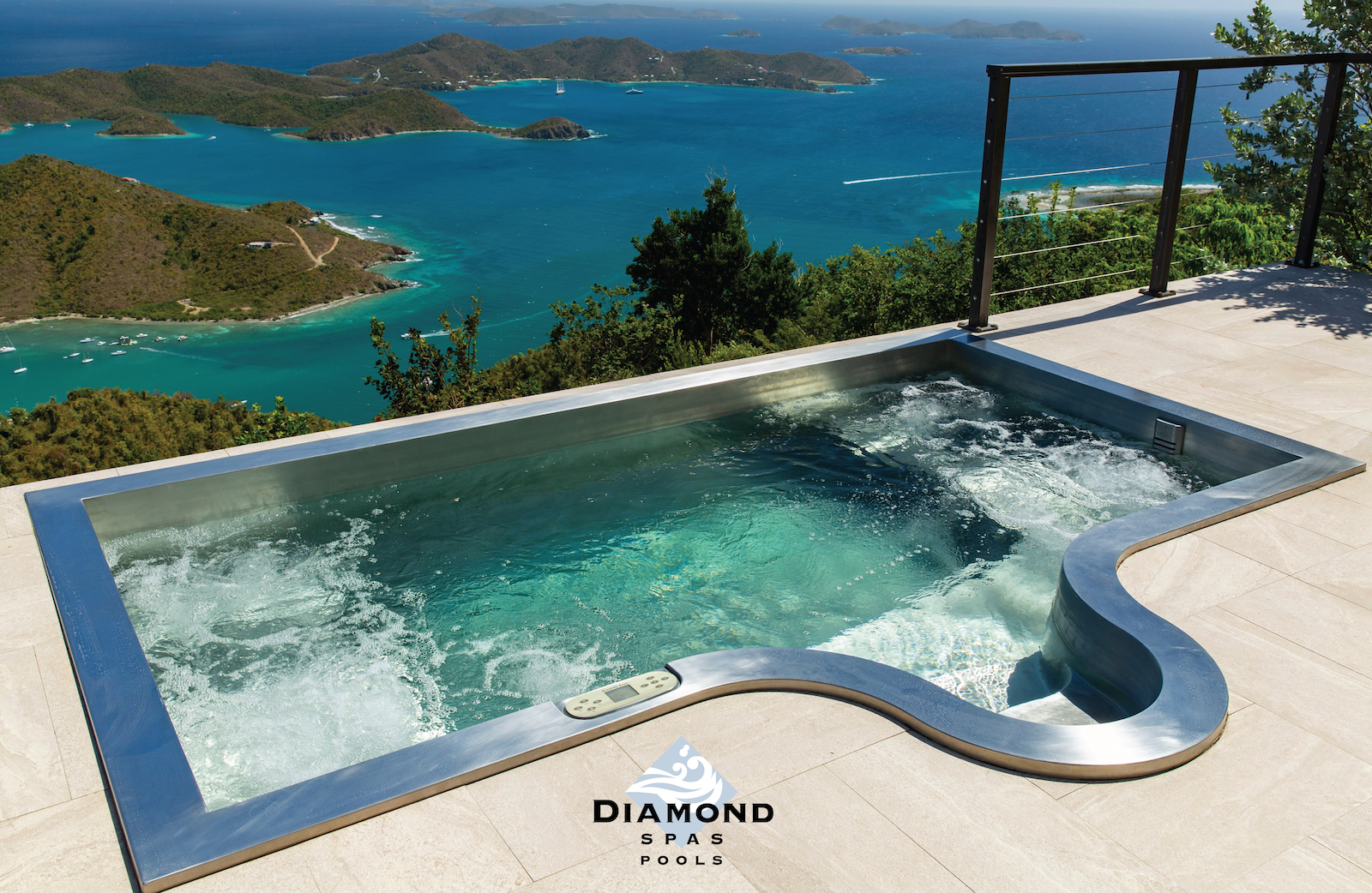 Custom stainless steel rooftop spa with LED lighting, two loungers, bench seating and interior descending stairway