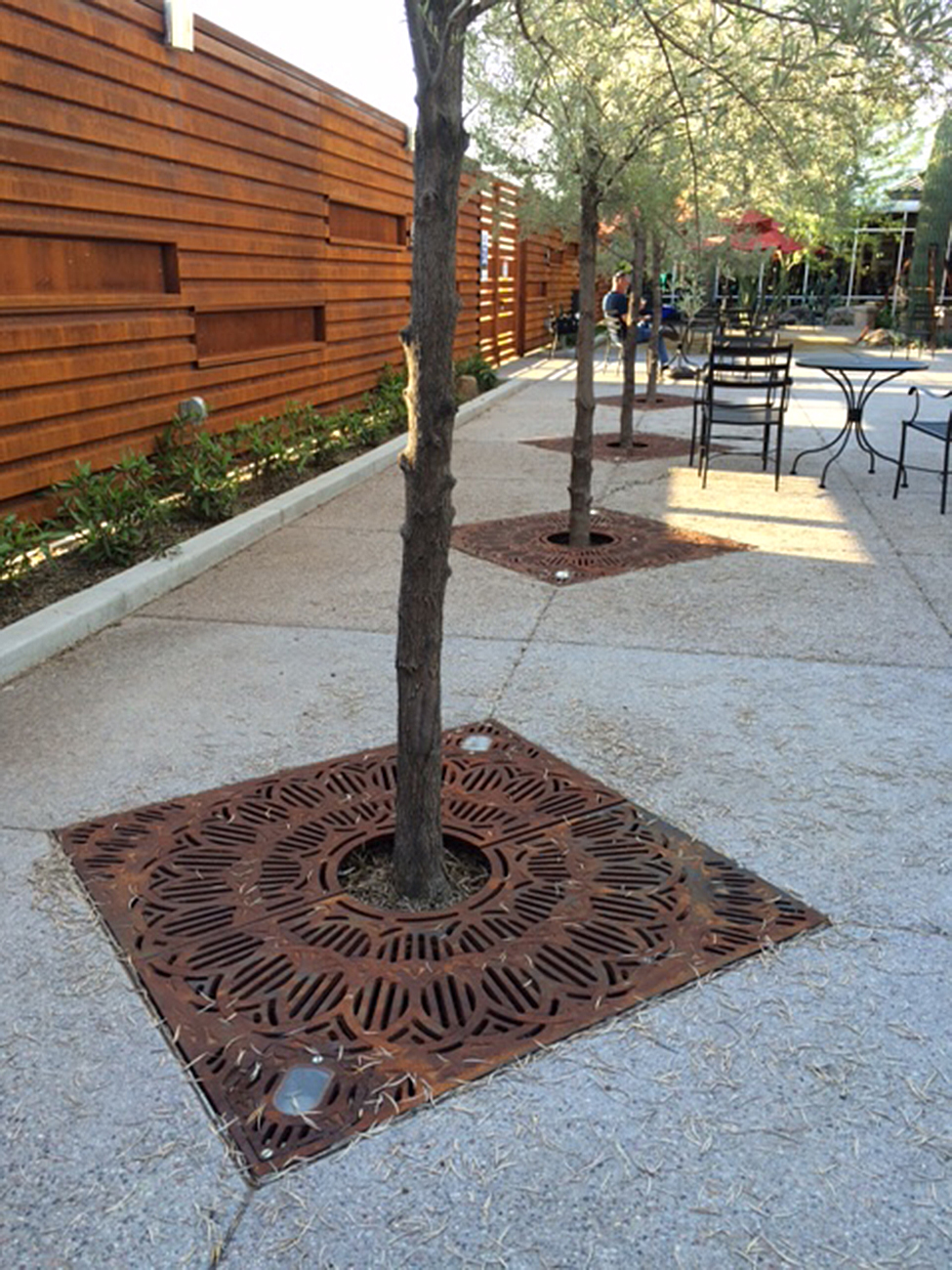 Del Sol, CAST IRON tree grate, 48" sqr, in halves, 1/2" maximum slot openings for A.D.A. compliance and pedestrian safety. TWO bolted lightwell covers per treewell.