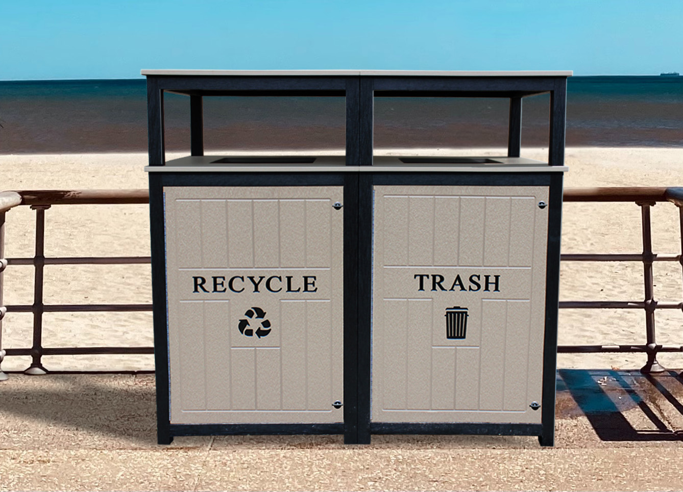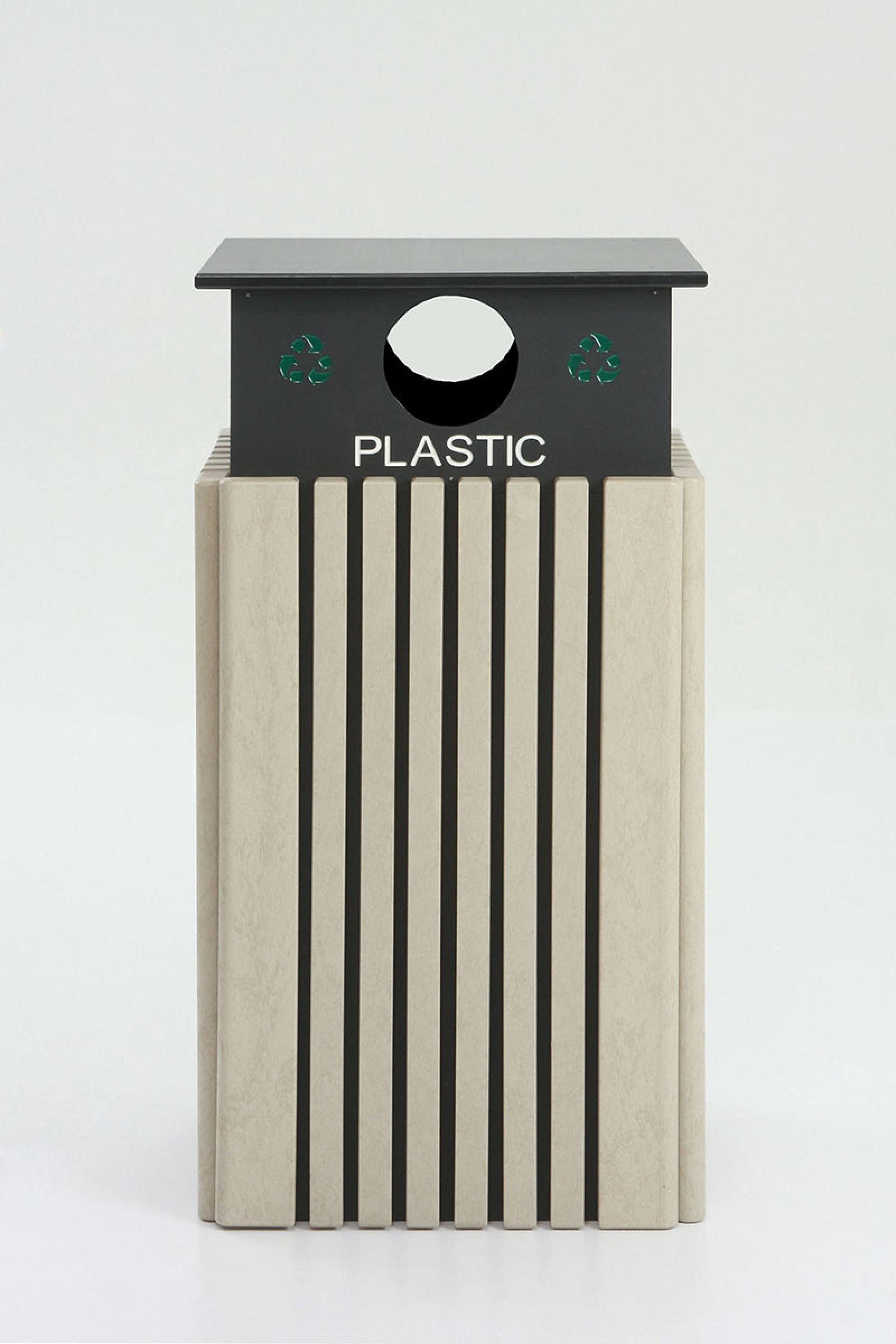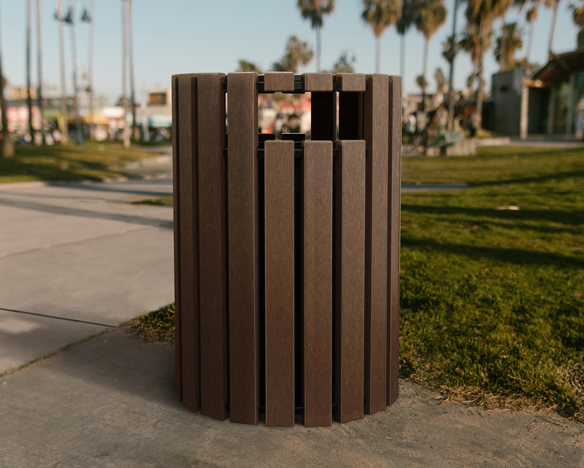 The Tall T40 Receptacles combine style and functionality to compliment the Green-Scapes line of benches and tables. They are available with the choice of a flat lid with a round opening, or a rain-cap cover, that can also be paired with 40-Gallon recycle receptacles to encourage separation of recyclables and trash. Includes a rigid liner and Easy-Bag System. (Contractor bags recommended due to the large capacity). Available with a black frame/lid and 7 maintenance-free base colors.