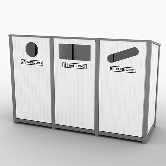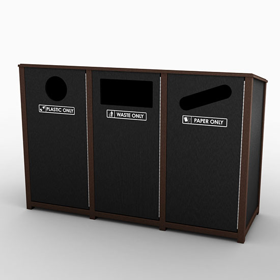 Side load enclosure for single stream recycling with bead board panel design, Units include front hinged doors for ease of liner removal. All units include liners. Available in two tone or solid colors. Our Earth Friendly Recyclers are constructed 97% recycled milk jugs. It is resistant to insect, mildew, mold, & graffiti. Won't split, rot, crack and never needs paint. Has UV inhibitors to prevent fading. Comes in 10 colors with multiple combinations available. Shown with Reverse Vail Top Option additional costs apply.