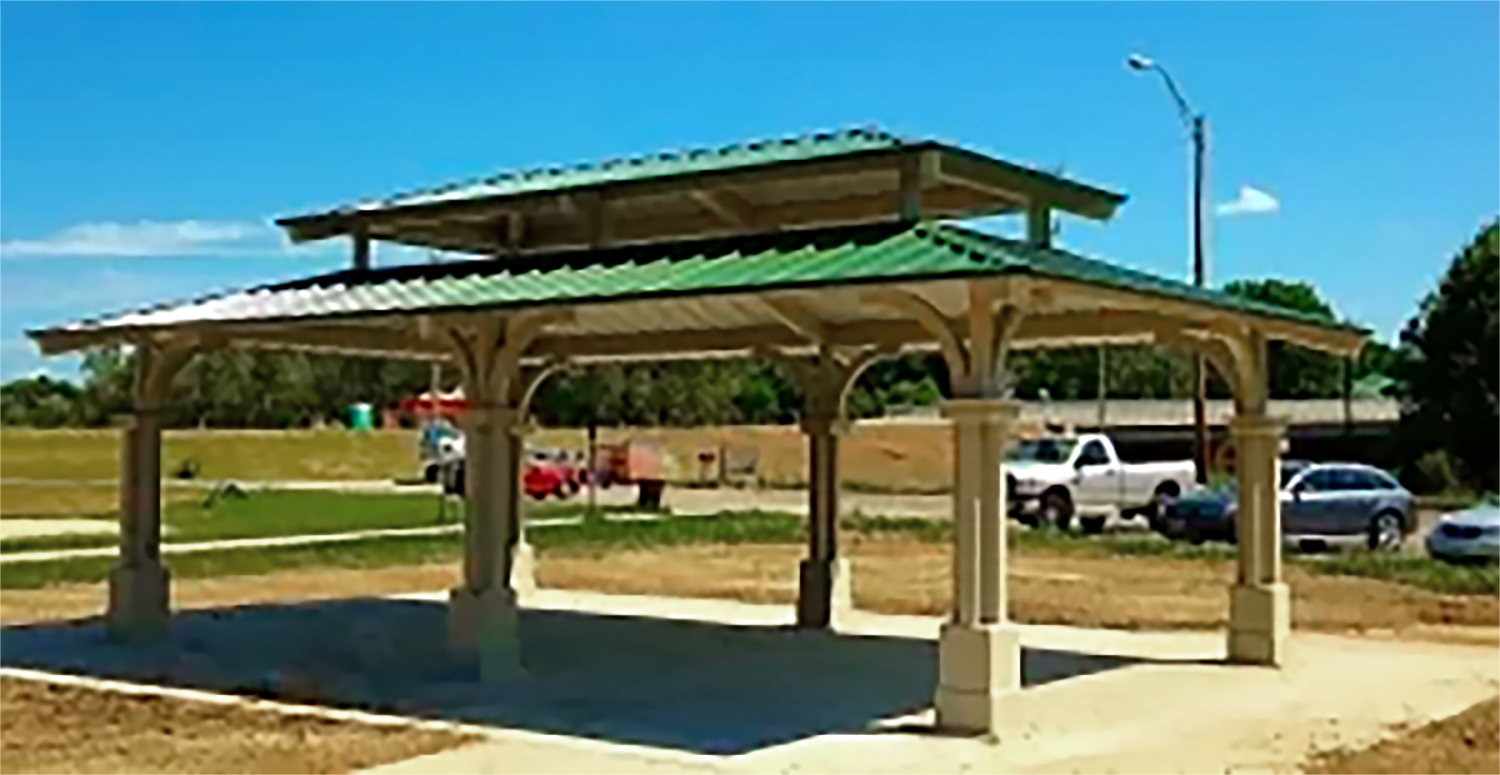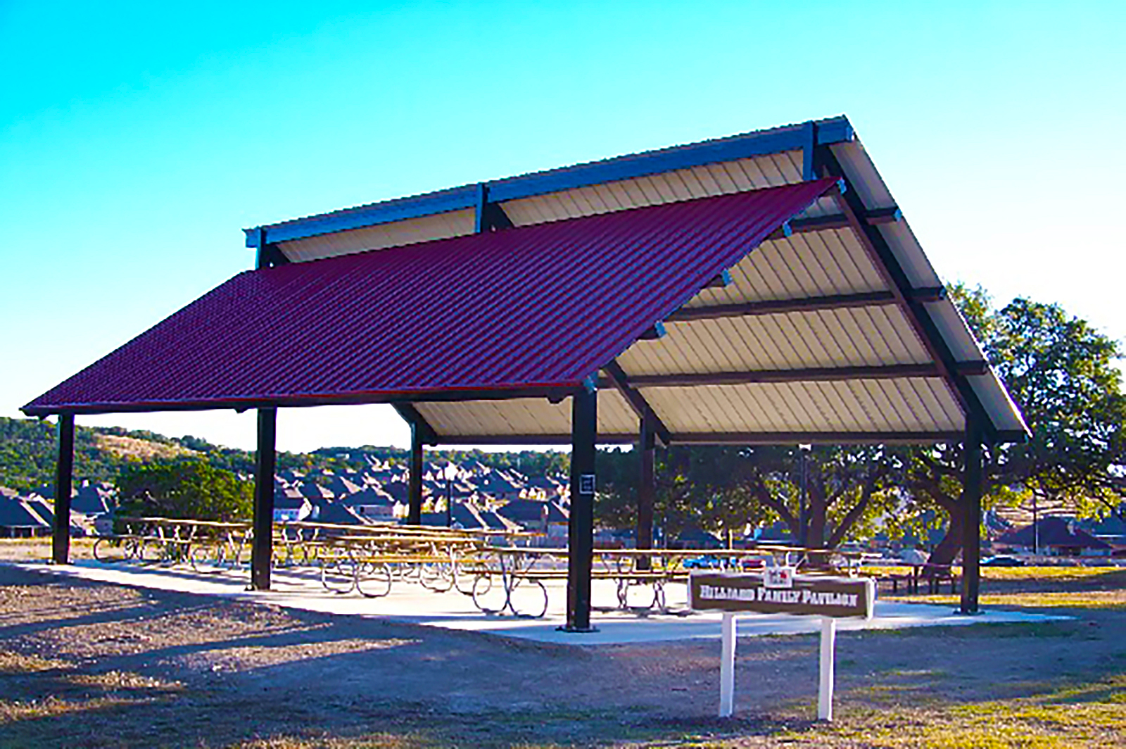 This custom all steel Sunburst-Gable shelter is located at Fort Sam Houston, Texas. Since 2008, custom designs and architectural ends for gable shelters have become our specialty. Discover our unmatched affordable quality.