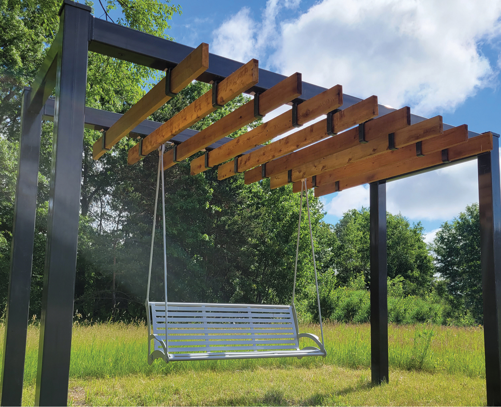 Add comfort & function to your structures Poligon Gliders provide seating for your structures in a fun new way. Constructed from commercial grade steel, the gliders are both comfortable and modern with horizontal slat seating and clean simple lines.
