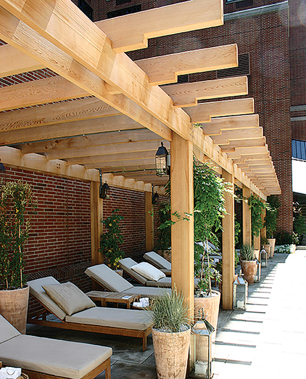 Designed for Longhouse Reserve in Easthampton, Long Island, this cantilevered pergola allows for unobstructed views. Laminated curved brackets provide strength and stability.