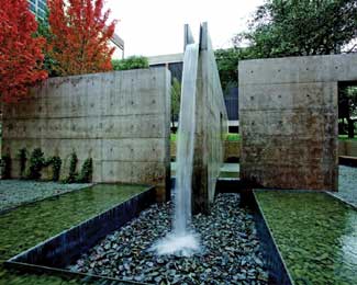 The cool colors of the concrete dividers, runnel edge and waterfall, zero-edge pool and collection basin are in contrast to the vibrant color of October glory maples. The plant choices are spare: sloped lawns under the existing large live oaks; English ivy at the base of walls and the maples concentrated at the interior court. The maples benefit from a sub- and surface-drainage system. Image: Tom Jenkins