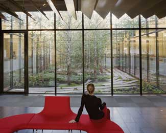 The main entry to the offices is between two courtyards. Two thousand square feet of greenery has been tucked into the 225,000 square feet of office space. The glass walls provide sightlines from the desk spaces. Image: Elizabeth Felicella