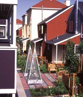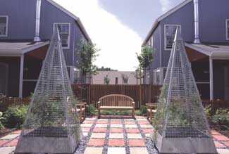 This multi-family condominium project occupies an industrial in-fill site. The landscaping solution creates an inviting neighborhood with a spacious feel from an otherwise limited area within a nonresidential setting. A central axial walkway unites the landscape design, which includes both traditional cottages and industrial lofts. An English perennial border on the cottage side provides detailed planting, which contrasts with the simple cubist plantings of bold colors and textures along the lofts. The entries of the project's three pedestrian plazas feature tuteurs, or steel structures for climbing vines, while a perforated metal mountain range graces an open space.