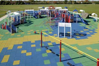 Unitary surfacing offers many functional advantages including low maintenance and low life cycle costs. Since the material is unitary in nature, extensive maintenance is not required in order to maintain consistent fall protection and wheelchair mobility. Within the unitary category pre-manufactured product supplied in mat or tile form are seen to offer additional advantages involving cost consistency and durability.