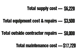 Michigan State University Athletic Turf Manager Amy Fouty found that artificial turf was not maintenance free, but that maintenance costs alone were only part of the expense. Fouty?EUR??,,????'???s annual equipment budget varied from US $8,250 to almost US $82,000. The need for outside contractors to consult or train maintenance staff could cost as much as US $3,000 a day, resulting in US $30 to US $70 per linear foot for repairs.