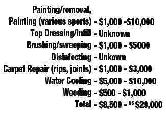 At Michigan State University, artificial field maintenance during the 2004-2005 season demonstrated that costs can vary greatly depending upon the individual field and its use. The following figures reflect the field surface?EUR??,,????'???s third year of use: