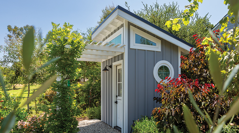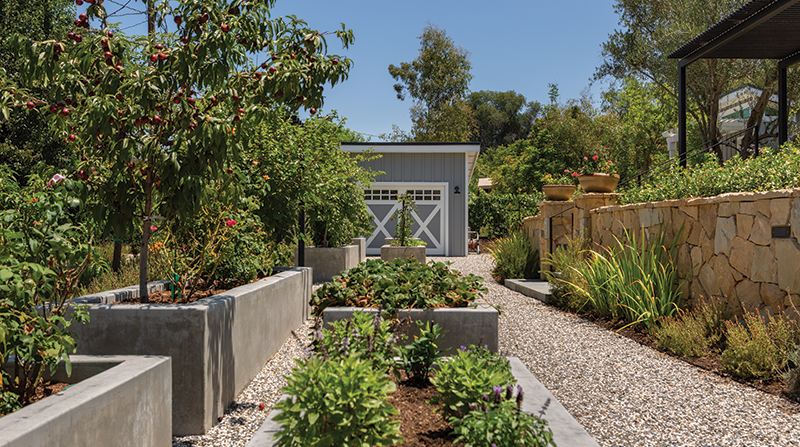A new firepit seating area and outdoor kitchen with a patio of Random Ashlar Bluestone from Cougar Stone were added at the main house level to expand the area for everyday family use. The original pool area and hillside space felt constricted and unused because it was blocked from view by dense Carrotwood Trees (Cupaniopsis anacardiodes) growing immediately off the back of the pool deck. With these trees removed, the upper level has reconnected with the main house. A wooden lattice patio cover and arbors over French doors now visually link this level with the ADU and the existing pool, which was re-tiled and re-plastered, and the spa, which was redesigned to be slightly elevated for easier access.